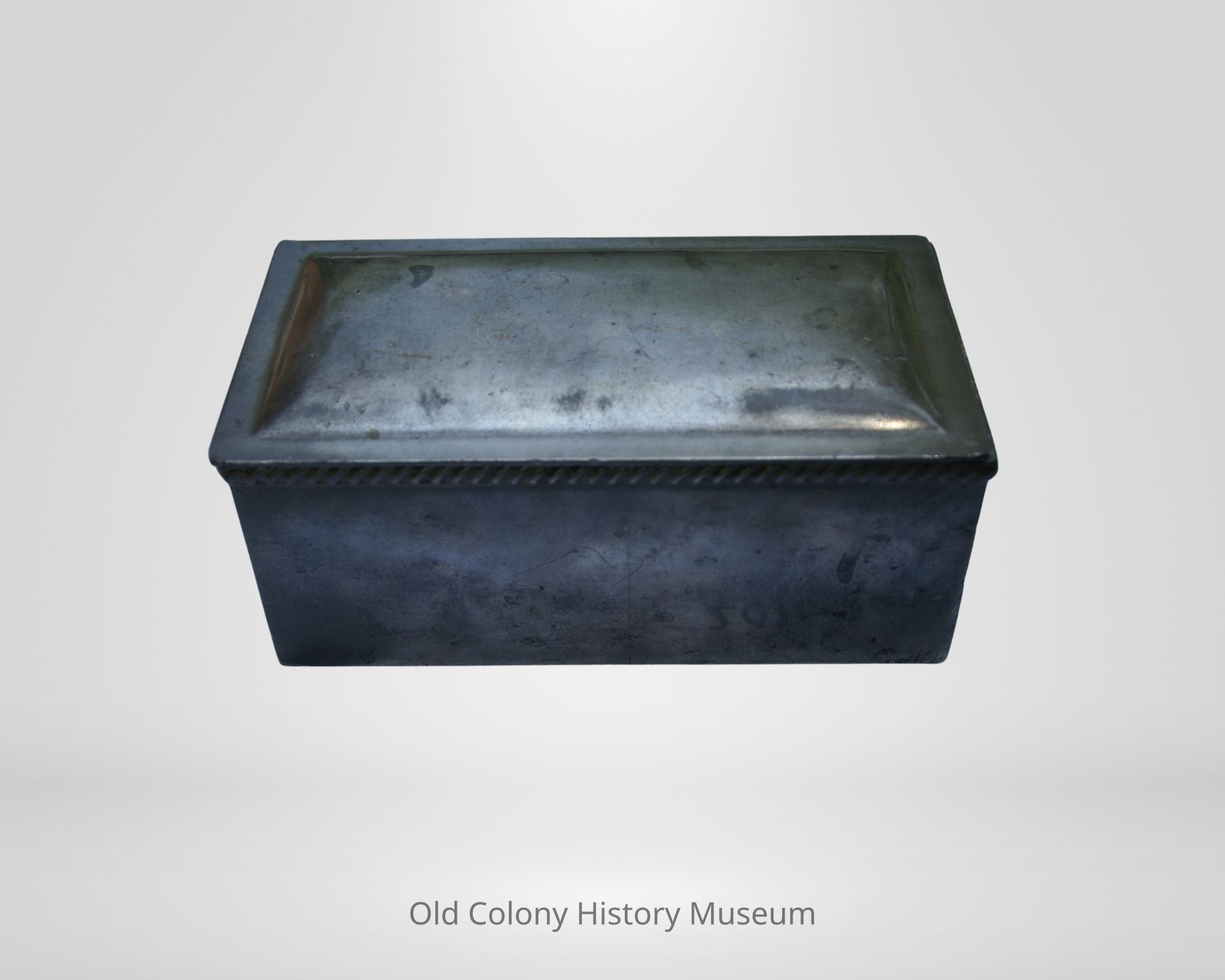 Rectangular pewter box with detachable lid. (a) Top has slightly domed rectangular top with a 3/8" wide flat band along the edges. Inner lip of top slants inward at end. Can still see tool marks from making the domed decoration of the lid. (b) Base of box has gadrooning band at top for decoration.
