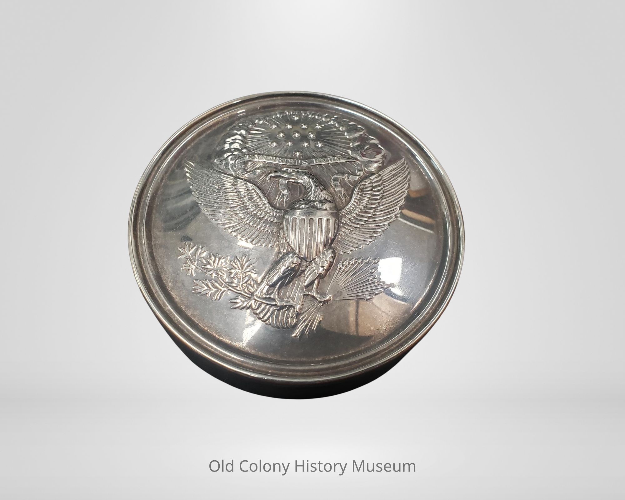 Circular shallow lid, central design is a raised, machine chased depiction of the Great Seal of the United States of America; base has a grooved edge to accommodate the lid, machine-turned interior, underside of the base is stamped "Winterthur REED & BARTON 146".Made/Created