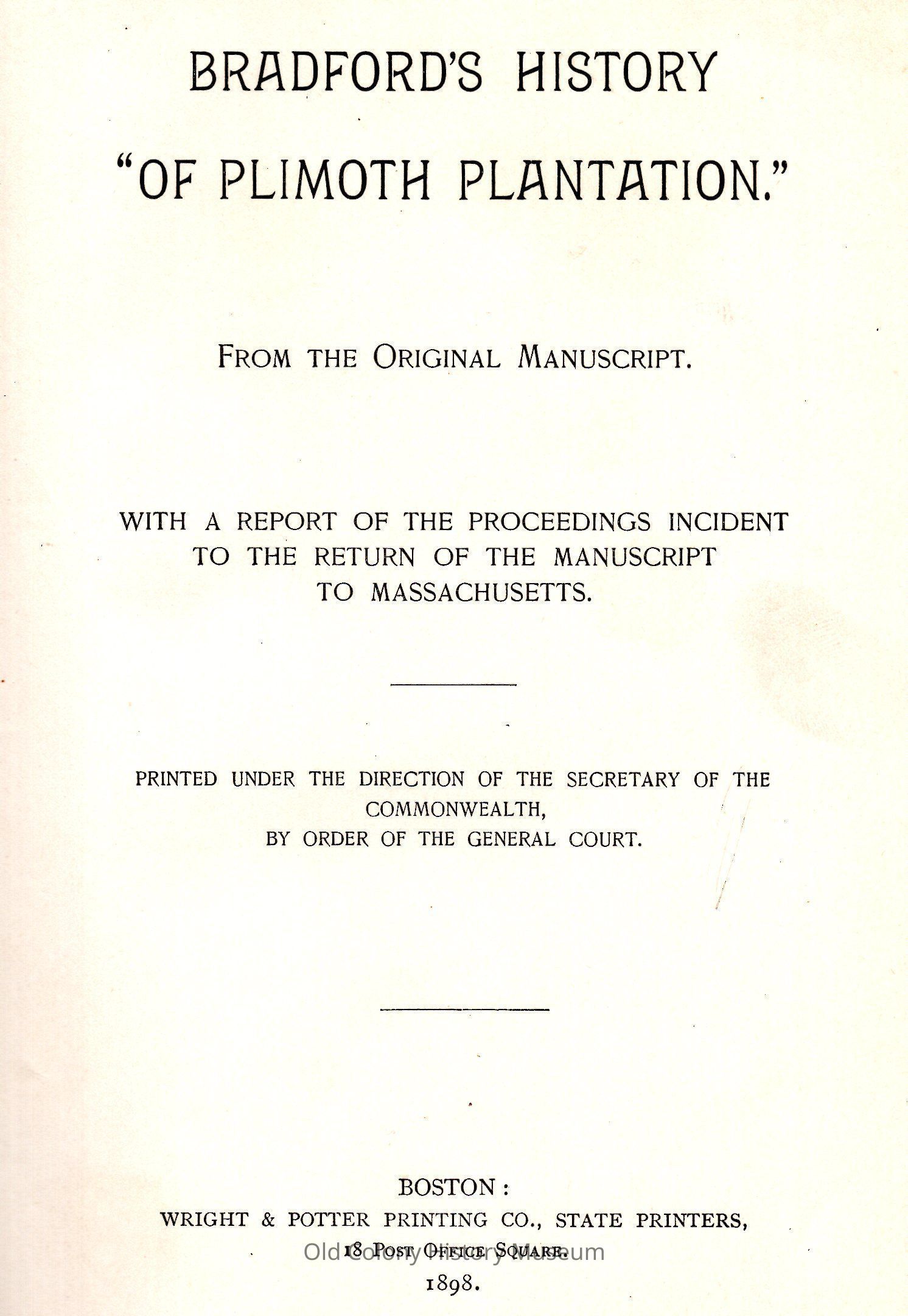 Bradford's History "Of Plimoth Plantation." From the Original Manuscript.Entry/Object ID