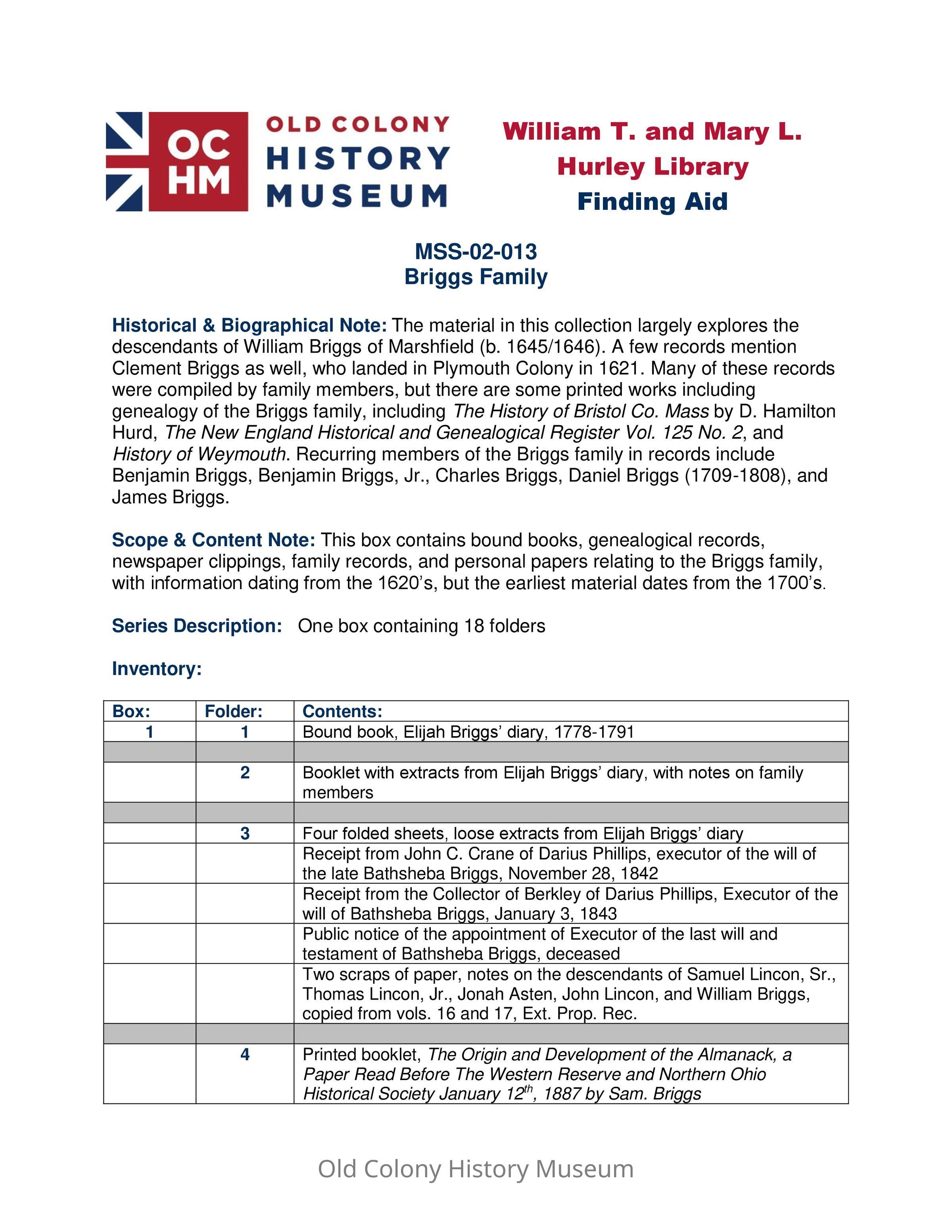 The material in this collection largely explores the descendants of William Briggs of Marshfield (b. 1645/1646). A few records mention Clement Briggs as well, who landed in Plymouth Colony in 1621. Many of these records were compiled by family members, but there are some printed works including genealogy of the Briggs family, including The History of Bristol Co. Mass by D. Hamilton Hurd, The New England Historical and Genealogical Register Vol. 125 No. 2, and History of Weymouth. Recurring members of the Briggs family in records include Benjamin Briggs, Benjamin Briggs, Jr., Charles Briggs, Daniel Briggs (1709-1808), and James Briggs.Archive Details