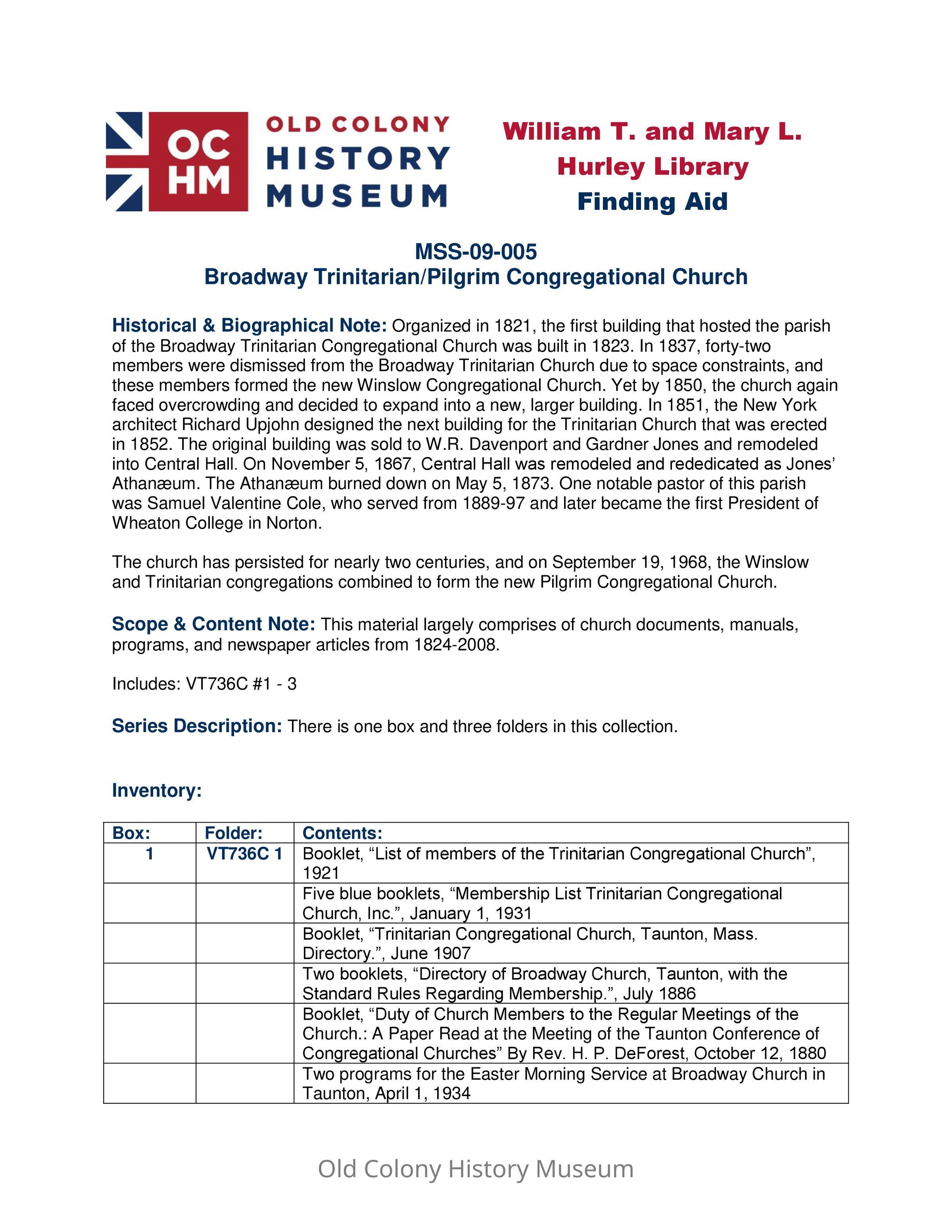 The church has persisted for nearly two centuries, and on September 19, 1968, the Winslow and Trinitarian congregations combined to form the new Pilgrim Congregational Church.Archive Details