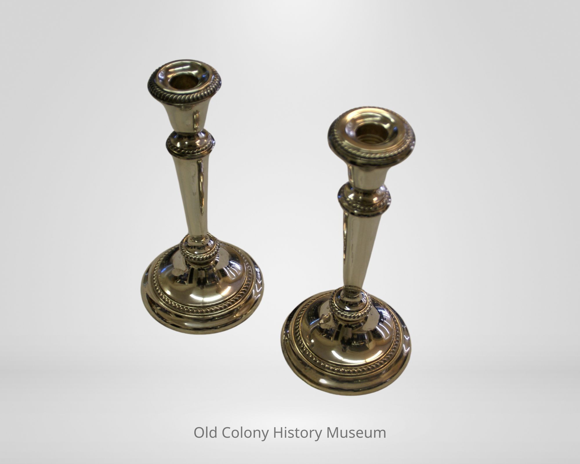 Pair of Poole Silver Co. candlesticks, 20th century. George II pattern. Each has cylindrical candle cup with curved flared babiche. Tall knobbed conical shaft and flared molded circular base. Bands of gadrooning accent babiche, shaft, and base.Lexicon