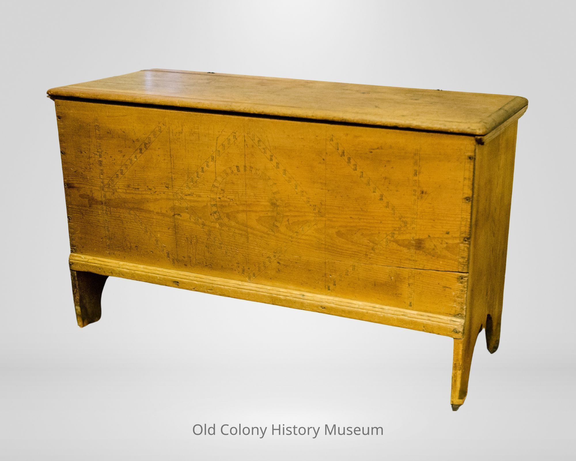 Six board chest with simple molded lid and spit nail hinges. Applied molding on bottom edge and under lip at ends. Legs formed by half-rounds with single center dart on end boards. Decorated on front with punchwork in geometric design. Has two facing "K's" on the front. Till with molded lid on inner left.Lexicon