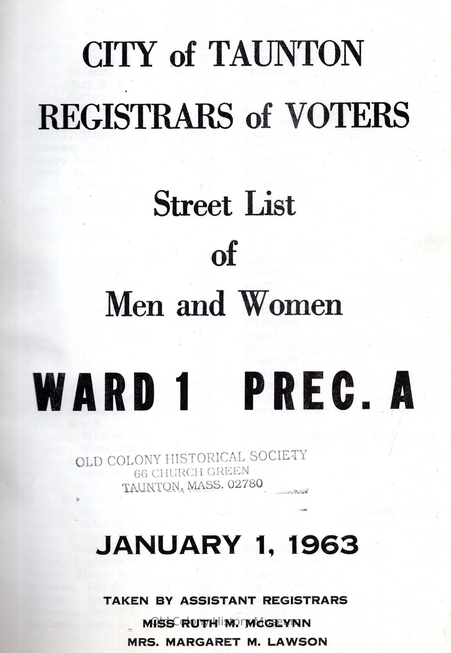 City of Taunton: Registrars of Voters Street List of Men and Women