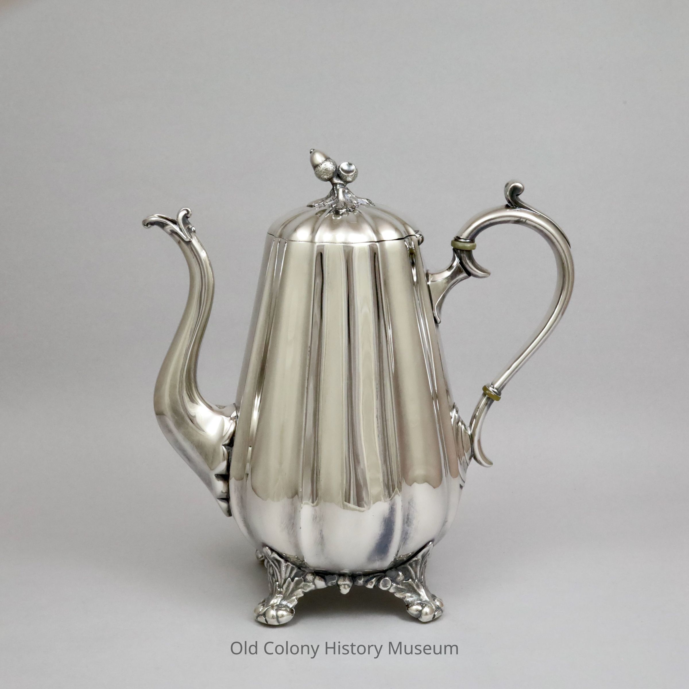 Reed & Barton silver plated coffee pot. Paneled baluster body with hinged lid with acorn finial. Scroll handle with spur at top and two off-white insulators. Faceted tapered S-shaped spout with scalloped edge attached to put and notched scroll accented tip. Foliated skirt and four paw feet with acanthus tops. Marked: "Reed & Barton 1925."