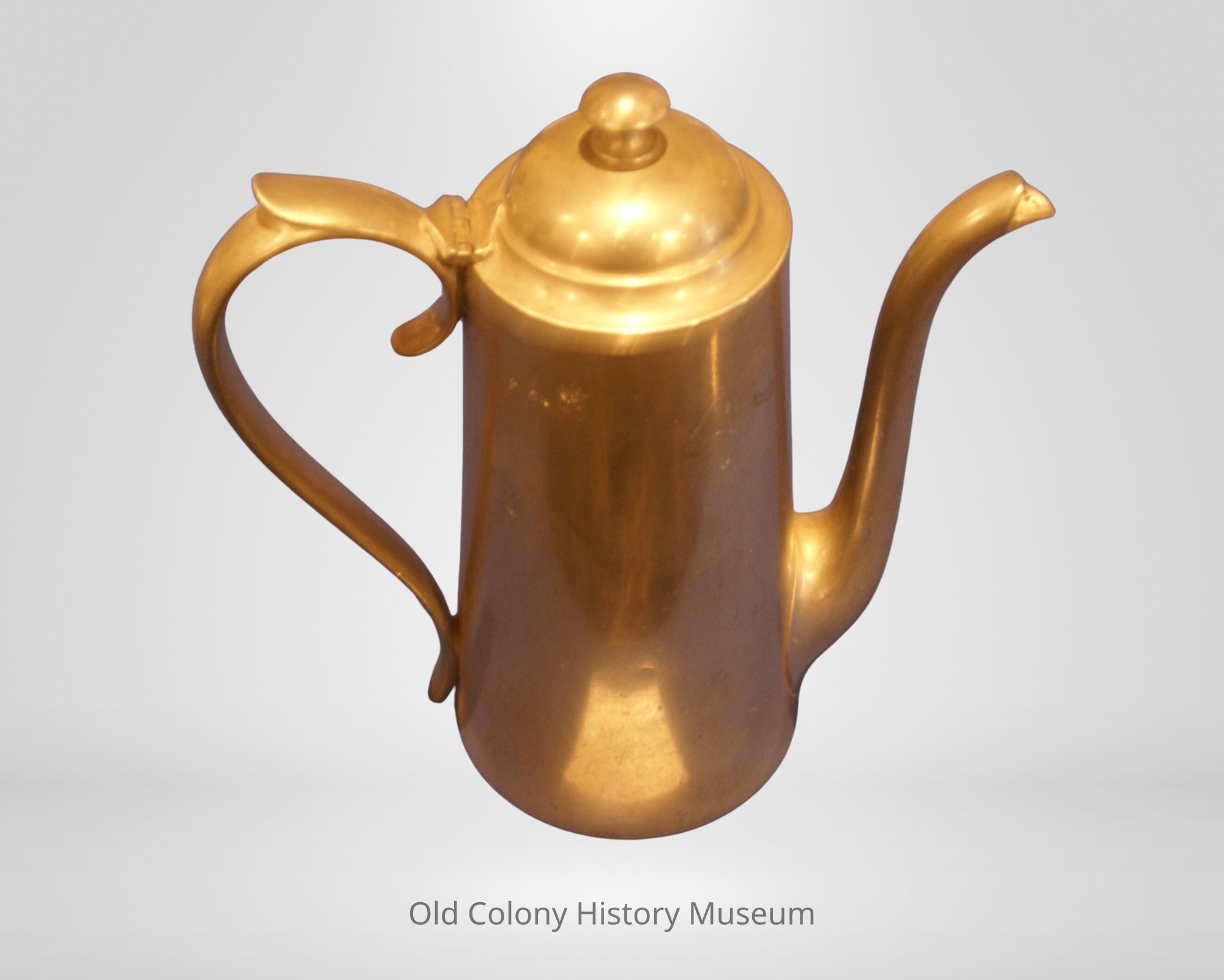Cylindrical coffeepot which tapers slightly toward stop. Hinged lid with stepped decoration and button finial at top. Hinge has decorative triangular shape. Applied handle has slight decorative flourish. Attaches near base of pot. Flat bottom. Spout long and straight with notch.Lexicon