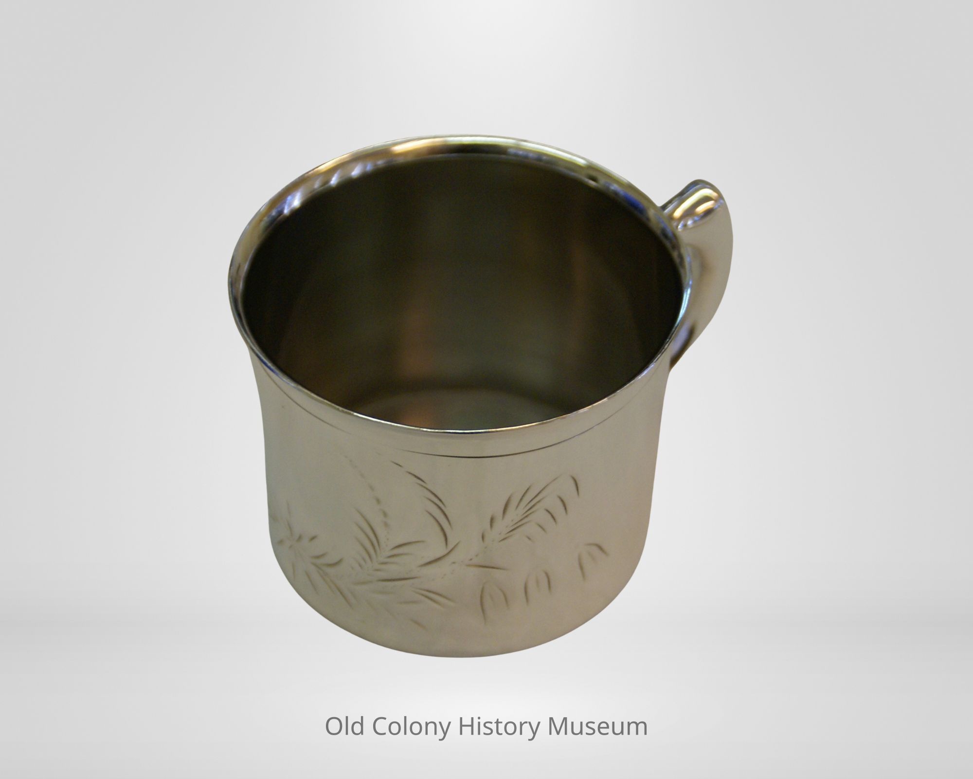 Silver cup, made by Poole & Roche, Taunton, #63. Plain cast handle. Flared lip. Engraved with floral sprays and a blank dedication area.