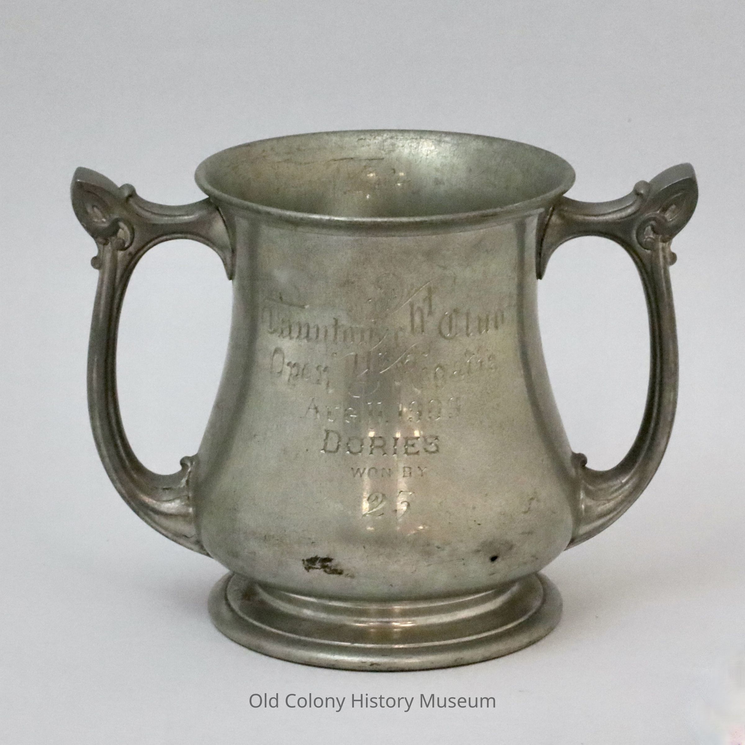 Pewter presentation cup with bulbous double handles. Inscribed with: "Taunton Yacht Club Open Regatta, Aug. 11, 1909 Dories Won by 23." The recipient was Alonzo K. Crowell. Marked: "Reed & Barton 340."Lexicon