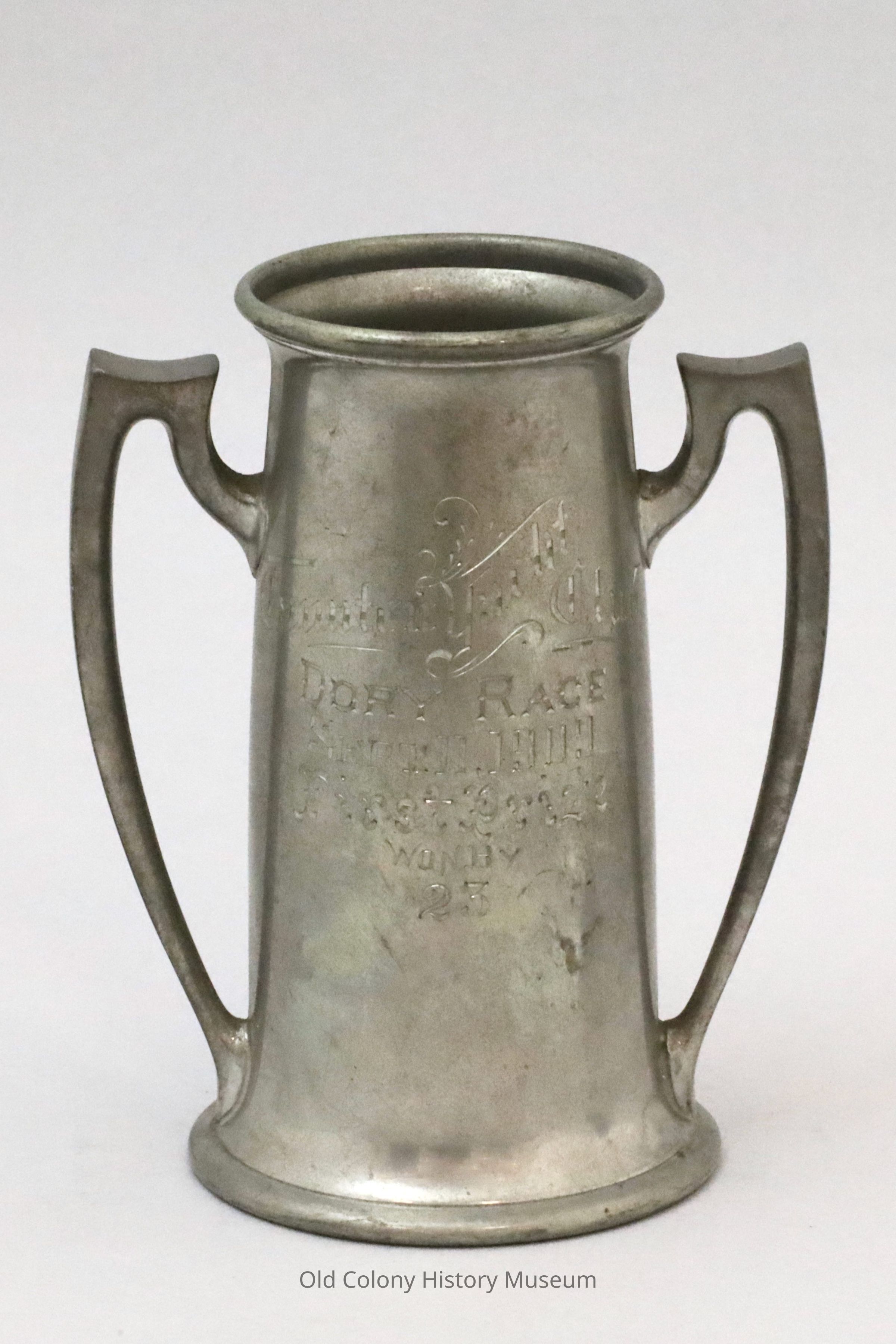 Conical shaped vessel with molded base and rolled lip and flanking handles. Inscribed with: "Taunton Yacht Club Dory Race Sept. 11, 1909. First Prize Won by 23." The recipient was Alonzo K. Crowell. Marked "Reed & Barton 390."Lexicon