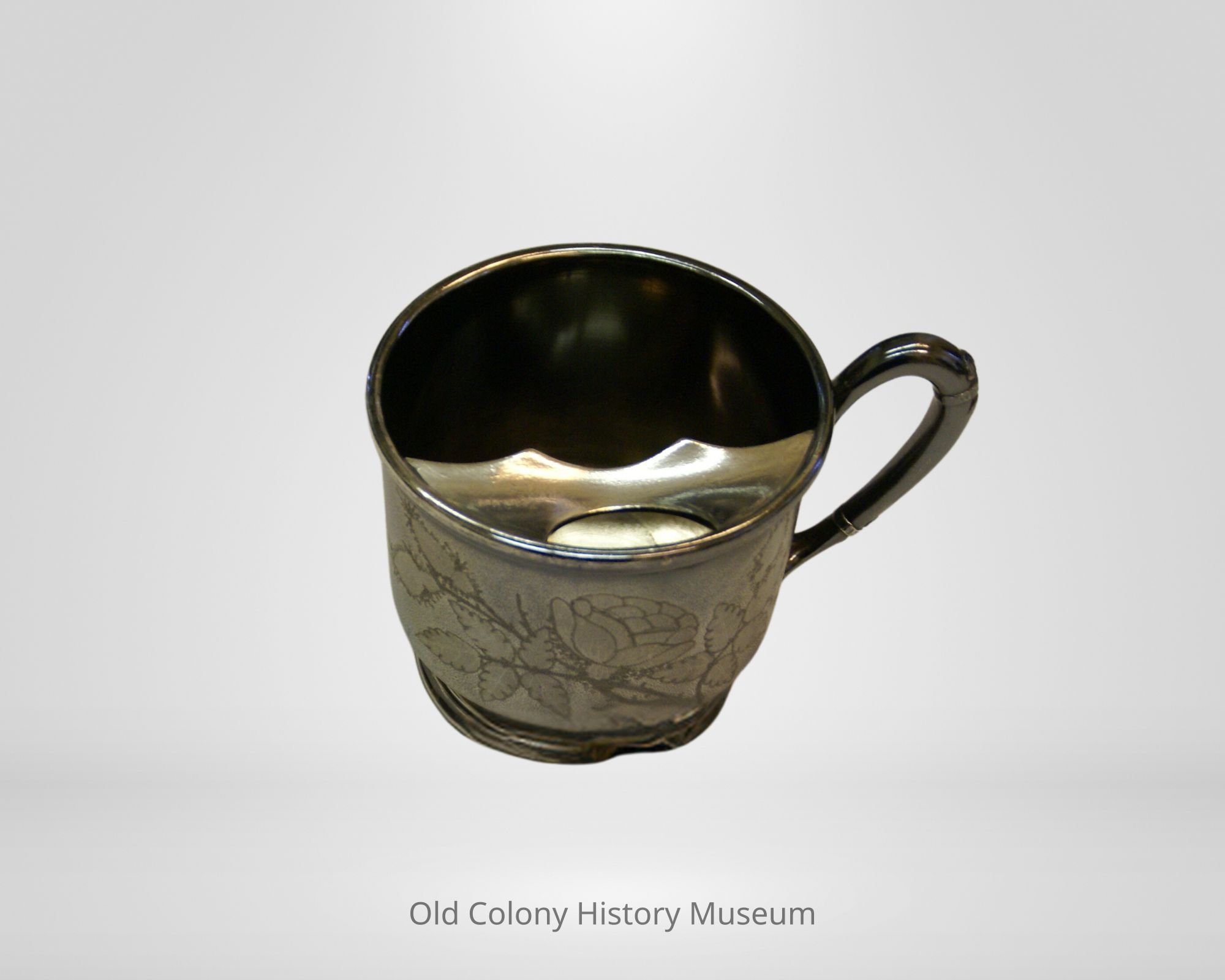 Silver plate moustache cup, Reed& Barton with poppy flower sprays engraved and molded lip and foot rim. Ear shaped handle with raised accents.