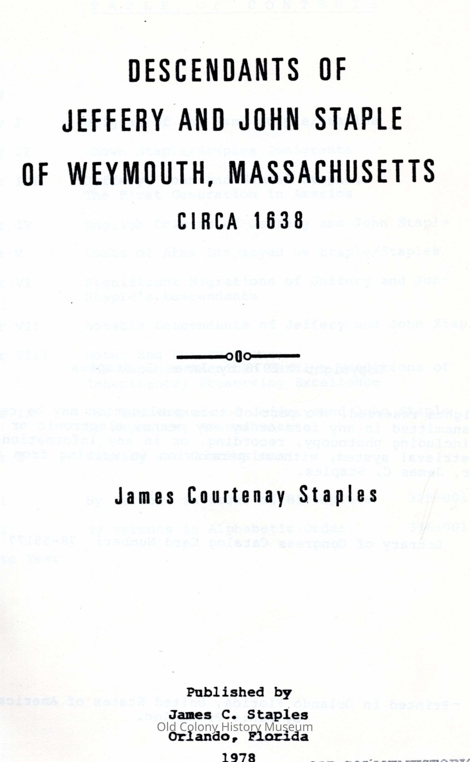 Descendants of Jeffery and John Staple of Weymouth, Massachusetts, circa 1638Entry/Object ID