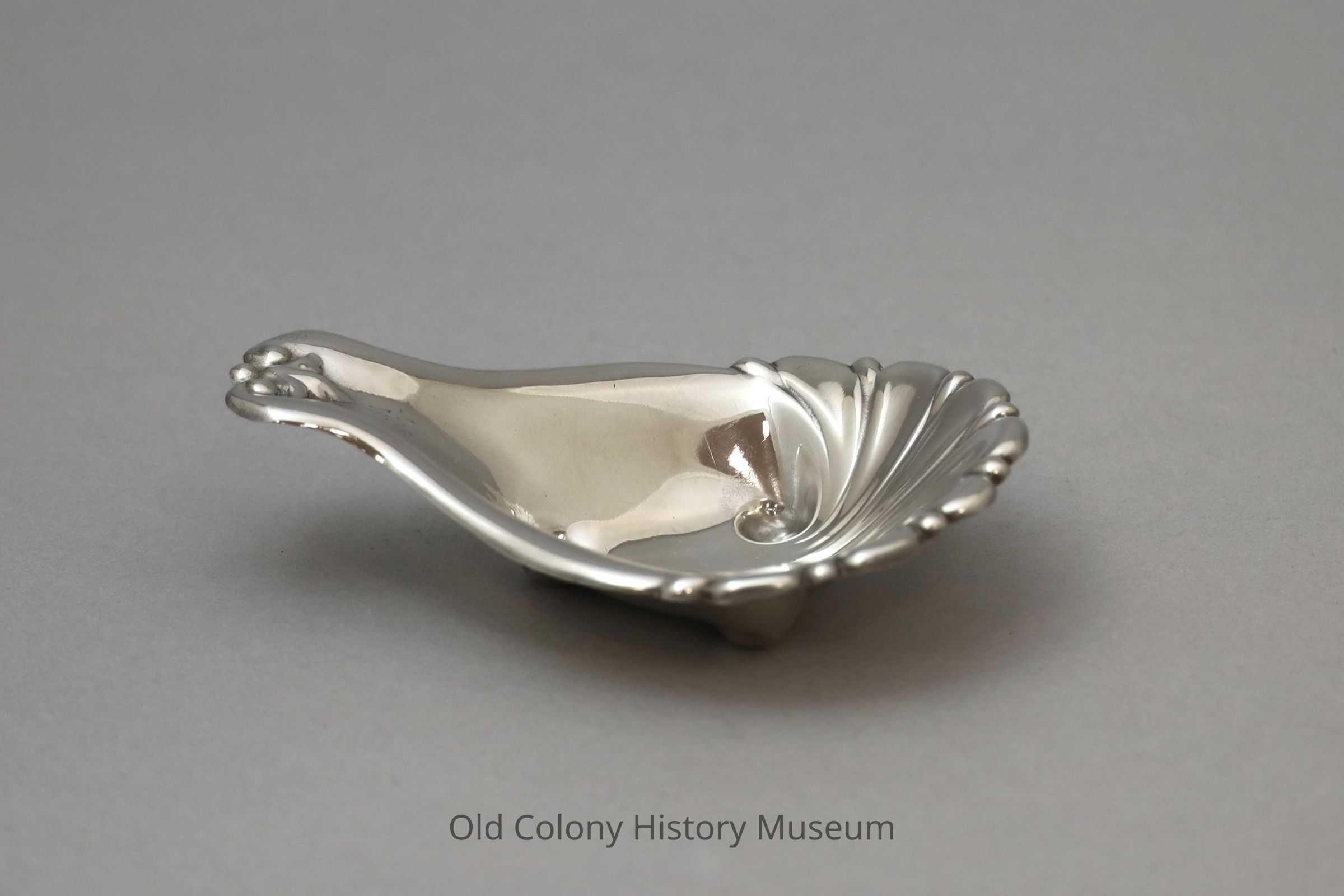 Oyster scalloped style dish, sterling silver, made by Reed & Barton marked: "Reed & Barton Sterling X200" and initialed "ASW." Three rests impressed through bottom.Lexicon