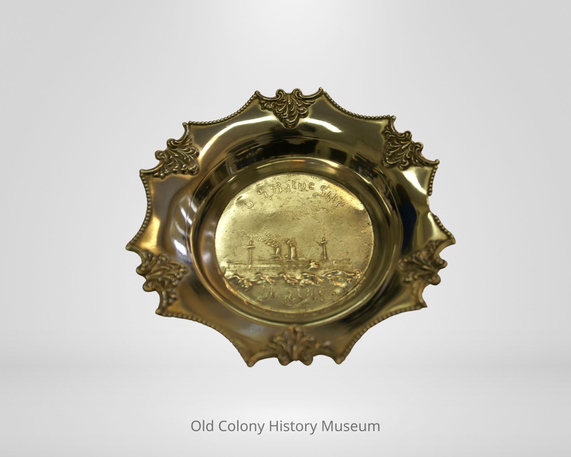 Quadruple plated silver bon-bon dish, commemorative piece, made by Poole Silver Co., #578. Footed with scalloped edge with alternating beaded and cartouche designs. Flat circular bottom with stamped image of ship on high seas. Inscription reads: "US Battle Ship Maine Blown up in Havana Harbor Feb. 15, 1898."Lexicon