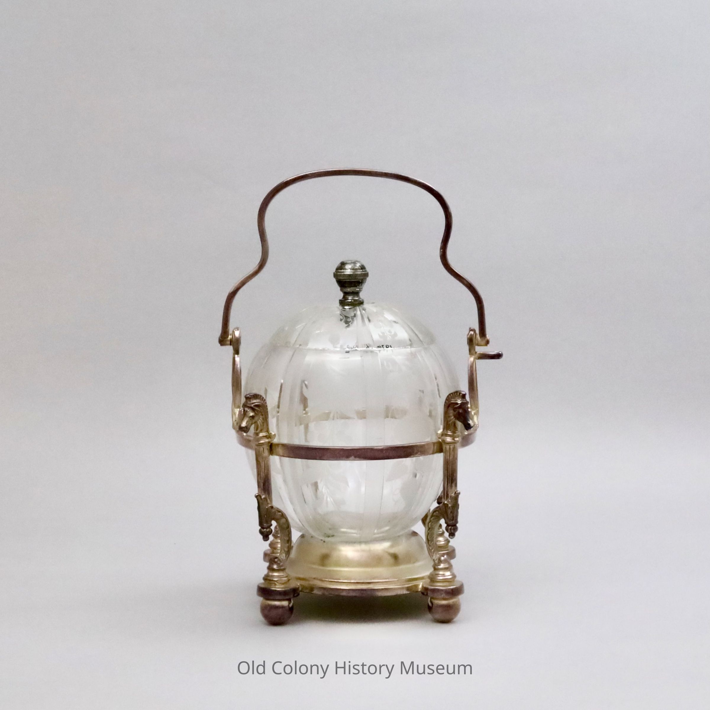 Glass pickle dish in silver-plated holder, made by Reed& Barton, #860. Colorless pumpkin shaped dish with 8 panels alternating etched design of morning glories and grape clusters. Domed lid with same design. Banded knob silver plated finial. Holder has hinged handle. Four columnar supports each topped by a molded horsehead. Lower half support has scroll shape with acanthus leaf accents. Four ball feet.Lexicon