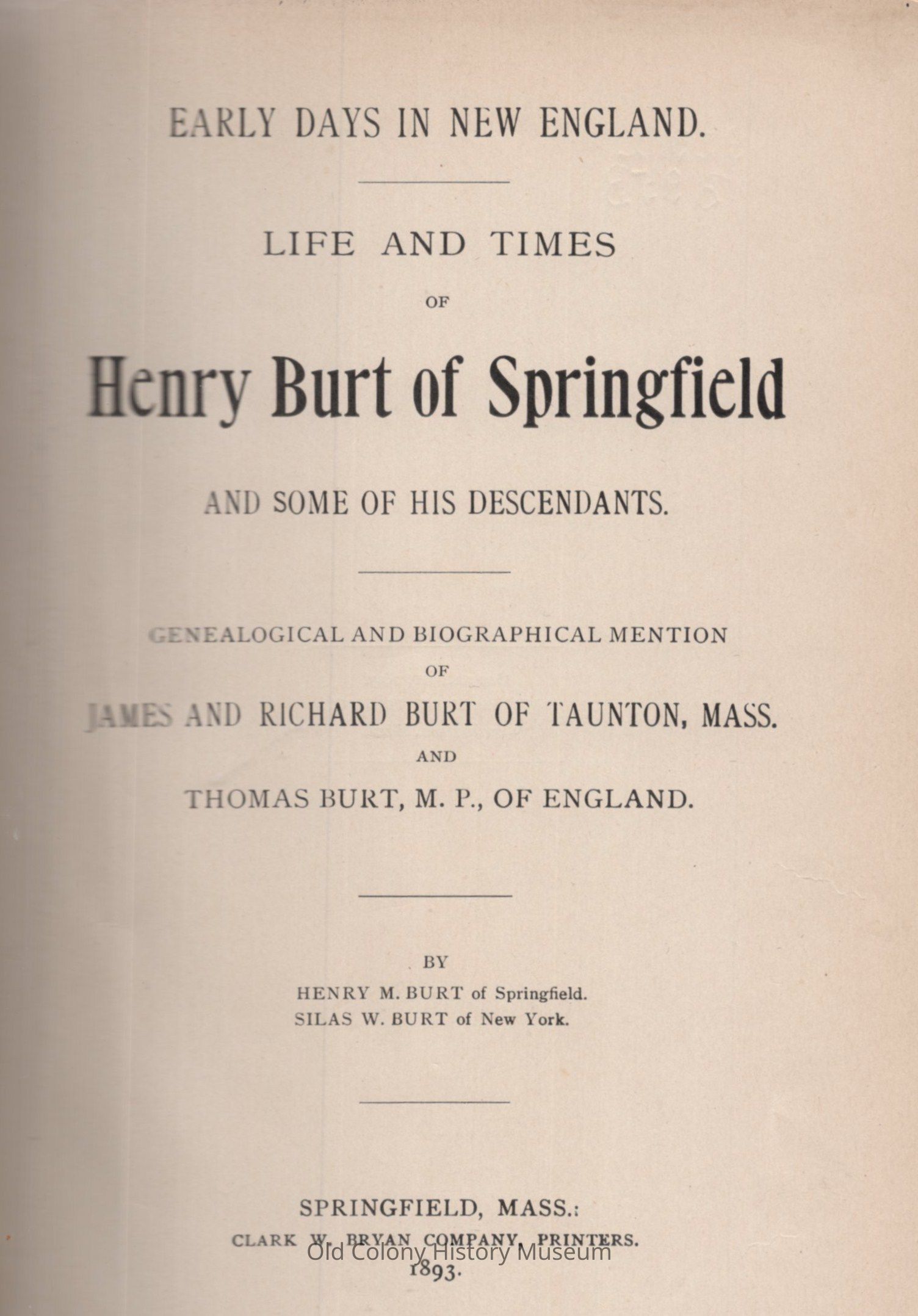 Early Days in New England. Life and Times of Henry Burt of Springfield and Some of his Descendants. Genealogical and biological mention of James and Richard Burt of Taunton, Mass., and Thomas Burt. M.P., of England.Entry/Object ID
