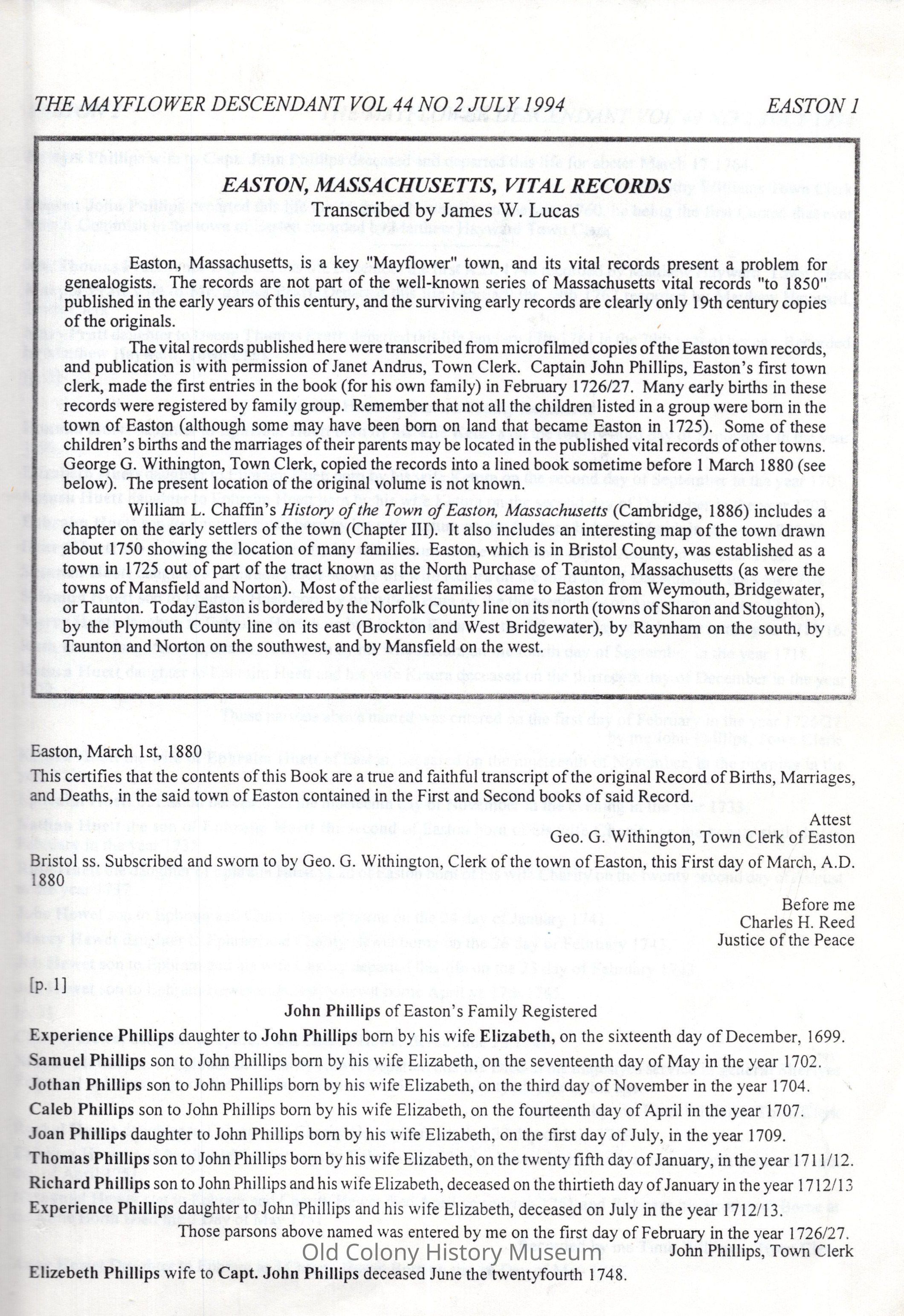 Partial listing of vital records from the Mayflower Descendant. vol. 44 July 1994 and vol. 45 January 1995