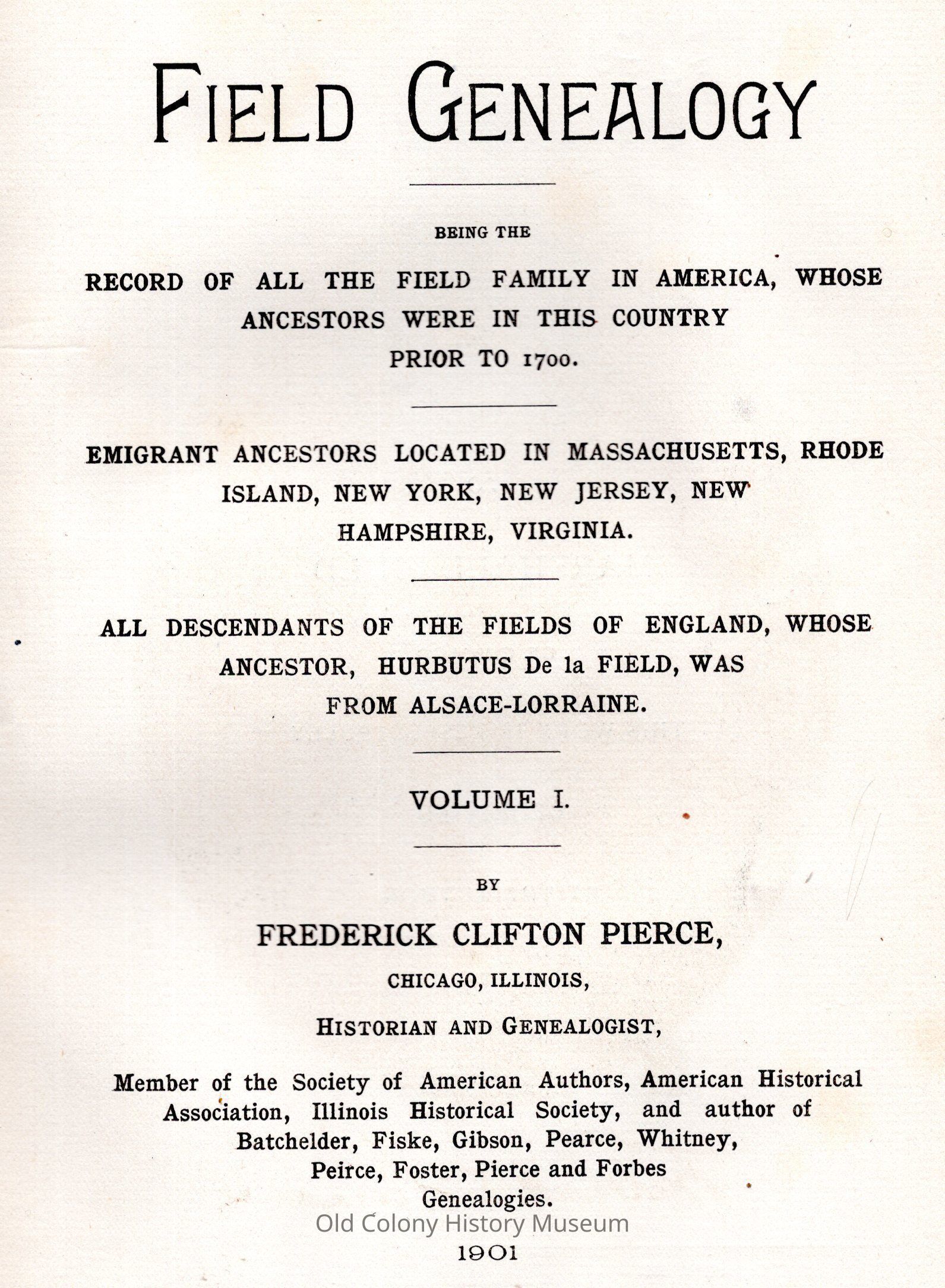 Field Genealogy: Being the Record of all the Field Family in America, Whose Ancestors were in this Country Prior to 1700. Emigrant ancestors located in Massachusetts, Rhode Island, New York, New Jersey, New Hampshire, Virginia. All descendants of the Fields of England, whose ancestor, Hurbutus de la Field, was from Alsace-LorraineEntry/Object ID