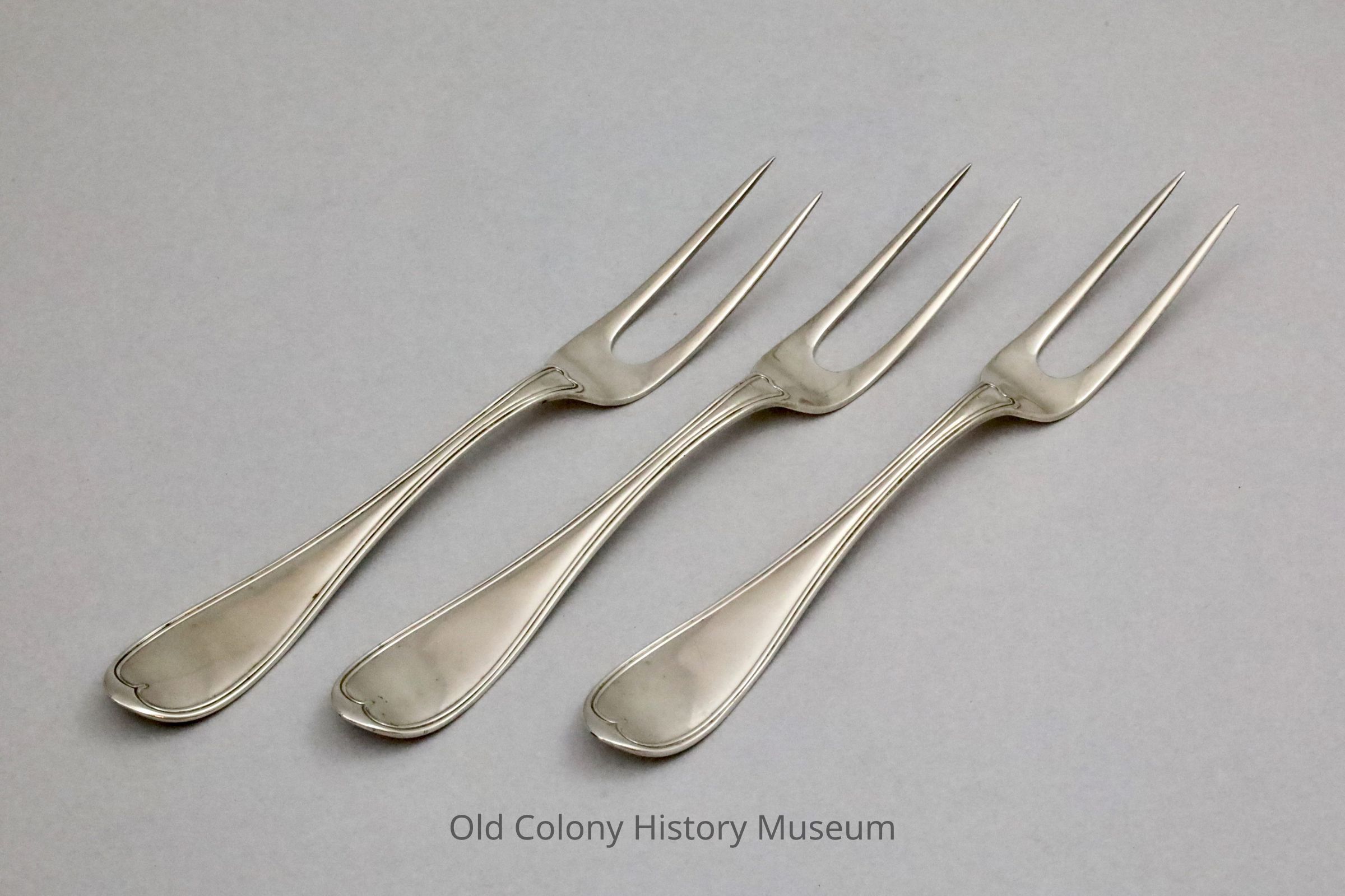 Three forks, with 2 -tines, made by Reed & Barton, "oval thread" pattern.