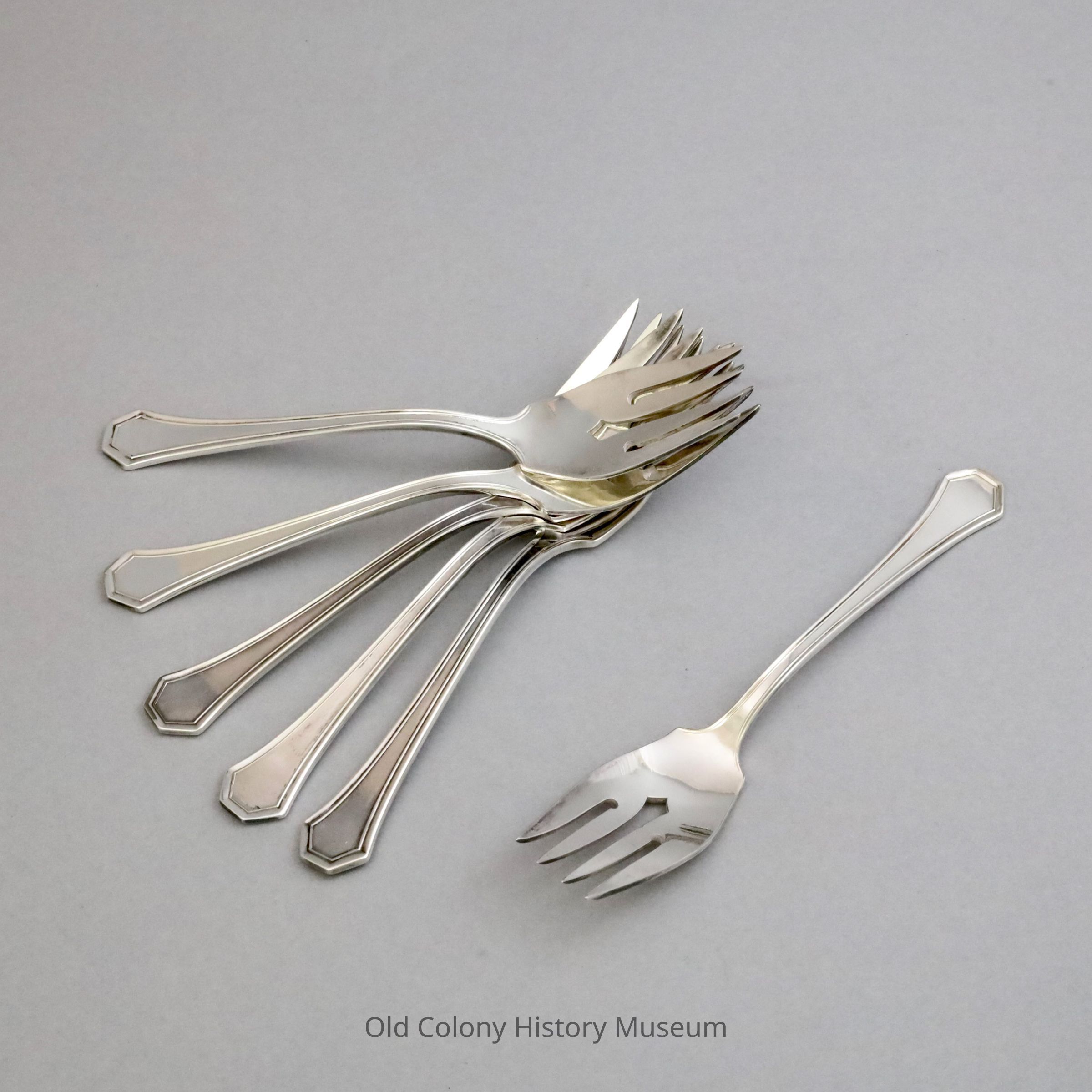 11 Reed & Barton silver plated luncheon forks in sierra pattern. Tines of each has triangular and curved cutouts. Tapered threaded handle with coffin end. See 2001.30 for meat fork in same pattern.Lexicon