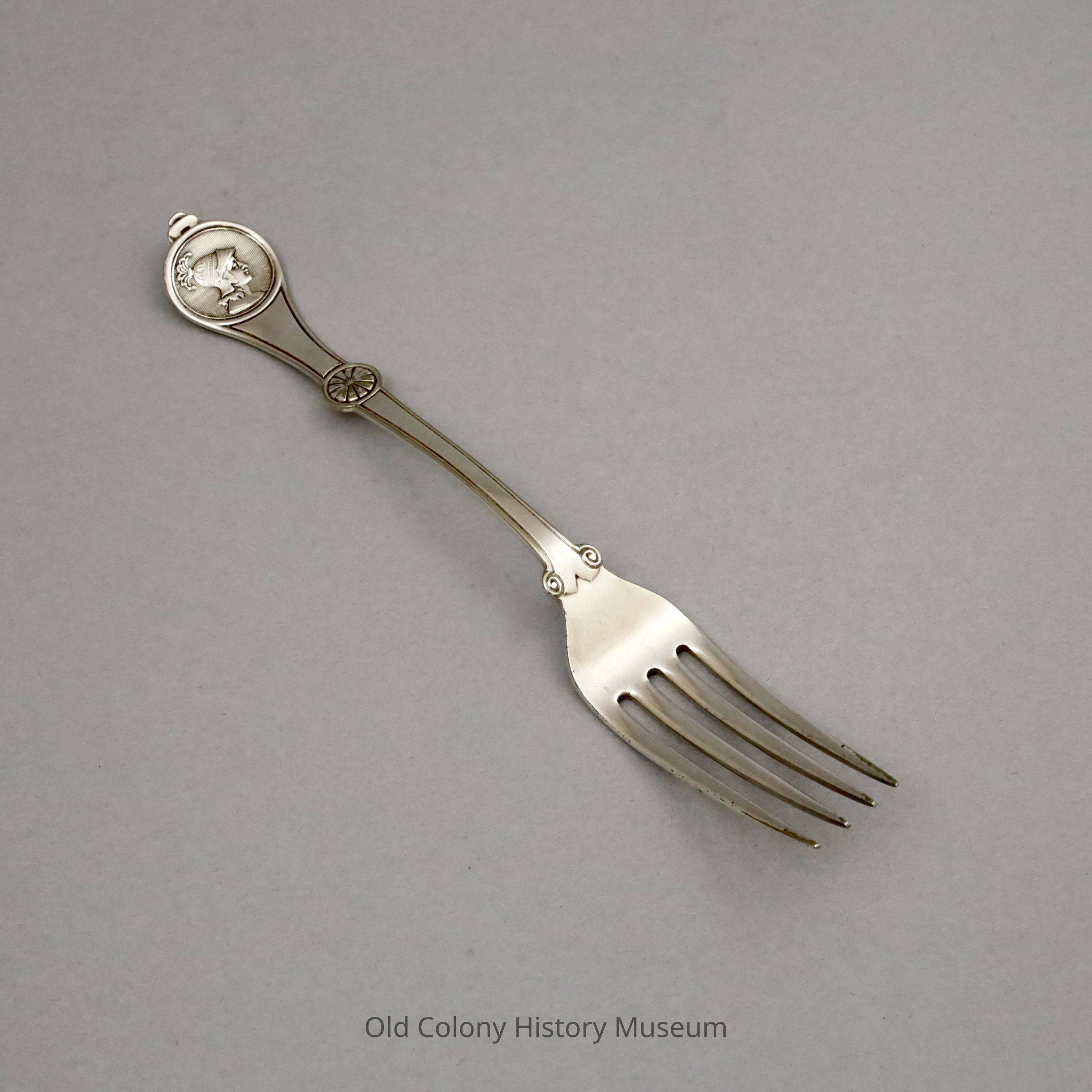 Luncheon fork in "Roman Medallion" style. Marked "REED&BARTON 8" and "PAT.DEC.29.1868" on the reverse. Tapered handle accented with a palmette at the center and knobbed circular medallion at the end which depicts a Roman soldier.Made/Created