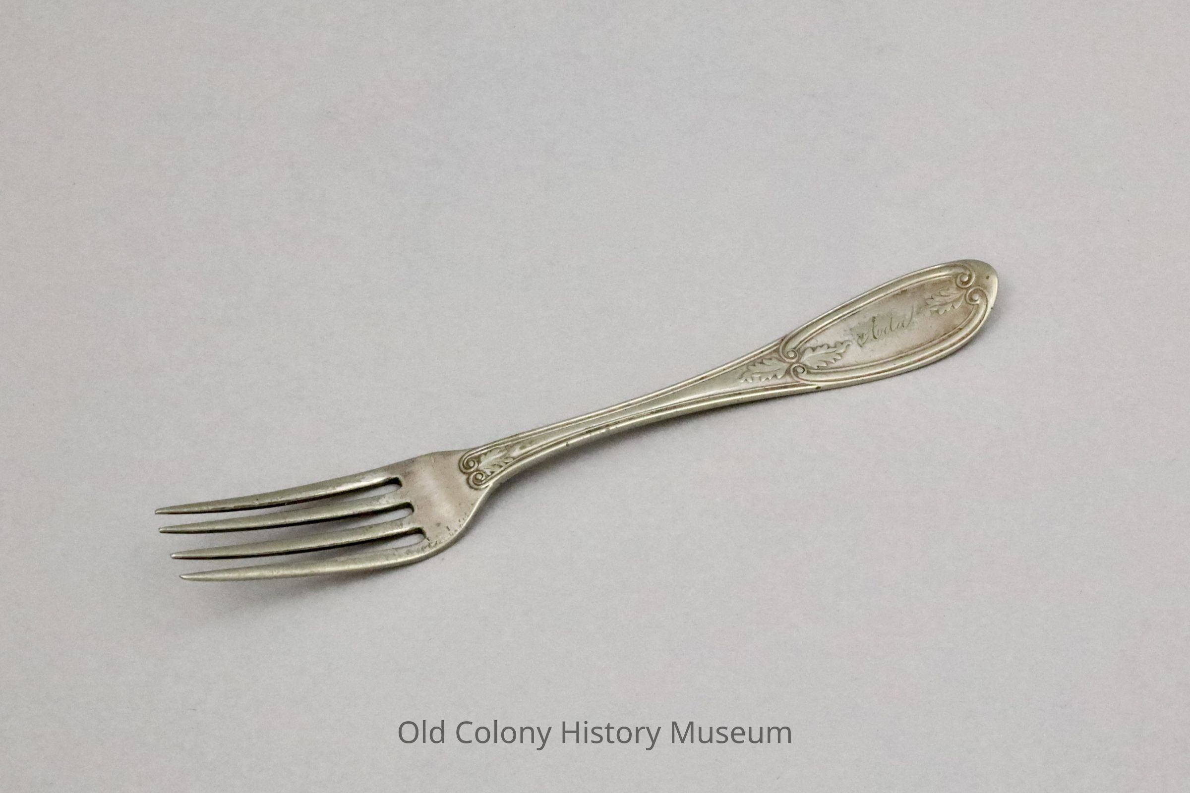 4 tined silver plated salad fork with simple scroll-leaf design. Scroll-leaf work on edges of beck and in circle around edges of handle. Leaf at top of handle, center, and bottom of neck. Imprinted on front and back. Engraved at handle in center of scroll circle, in simple script, "Ada." Matches 2007.38.Lexicon