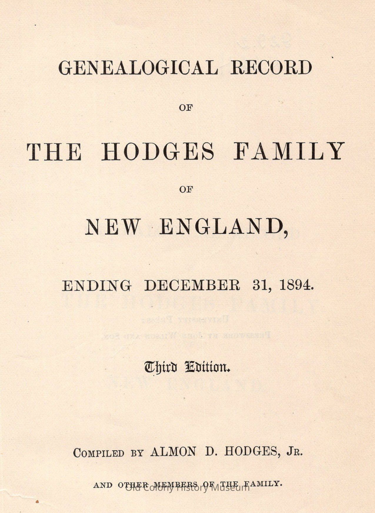 Genealogical Record of the Hodges Family of New England, Ending December 31, 1894.Entry/Object ID