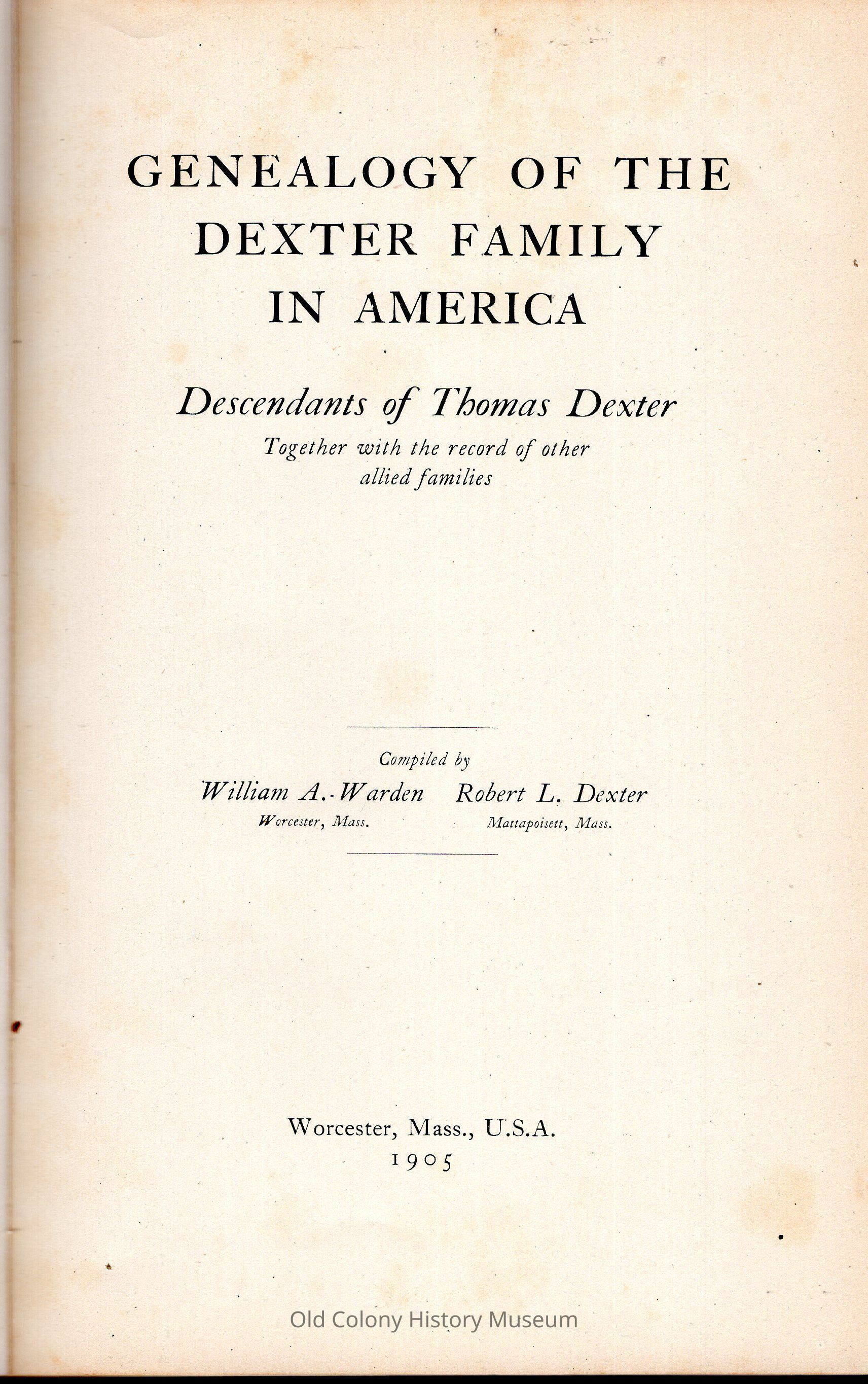 Genealogy of the Dexter Family in America: Descendants of Thomas Dexter, Together with a Record of Other Allied FamiliesEntry/Object ID