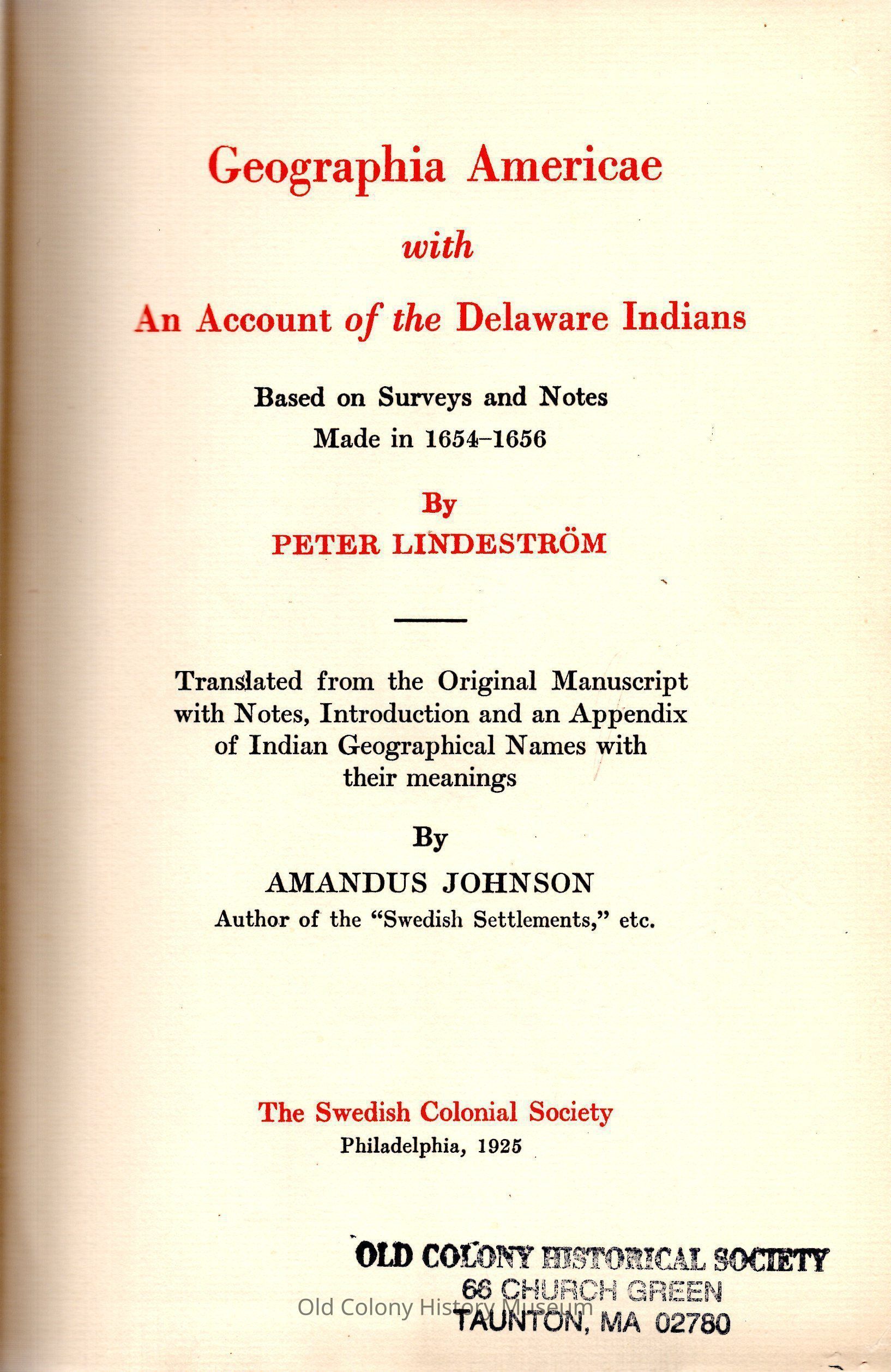 Geographia Americae with an account of the Delaware Indians; based on surveys and notes made in 1654-1656, by Peter Lindestrom; translated from the original manuscript with notes, introduction and an appendix of Indian geographical names with their meanings.Entry/Object ID