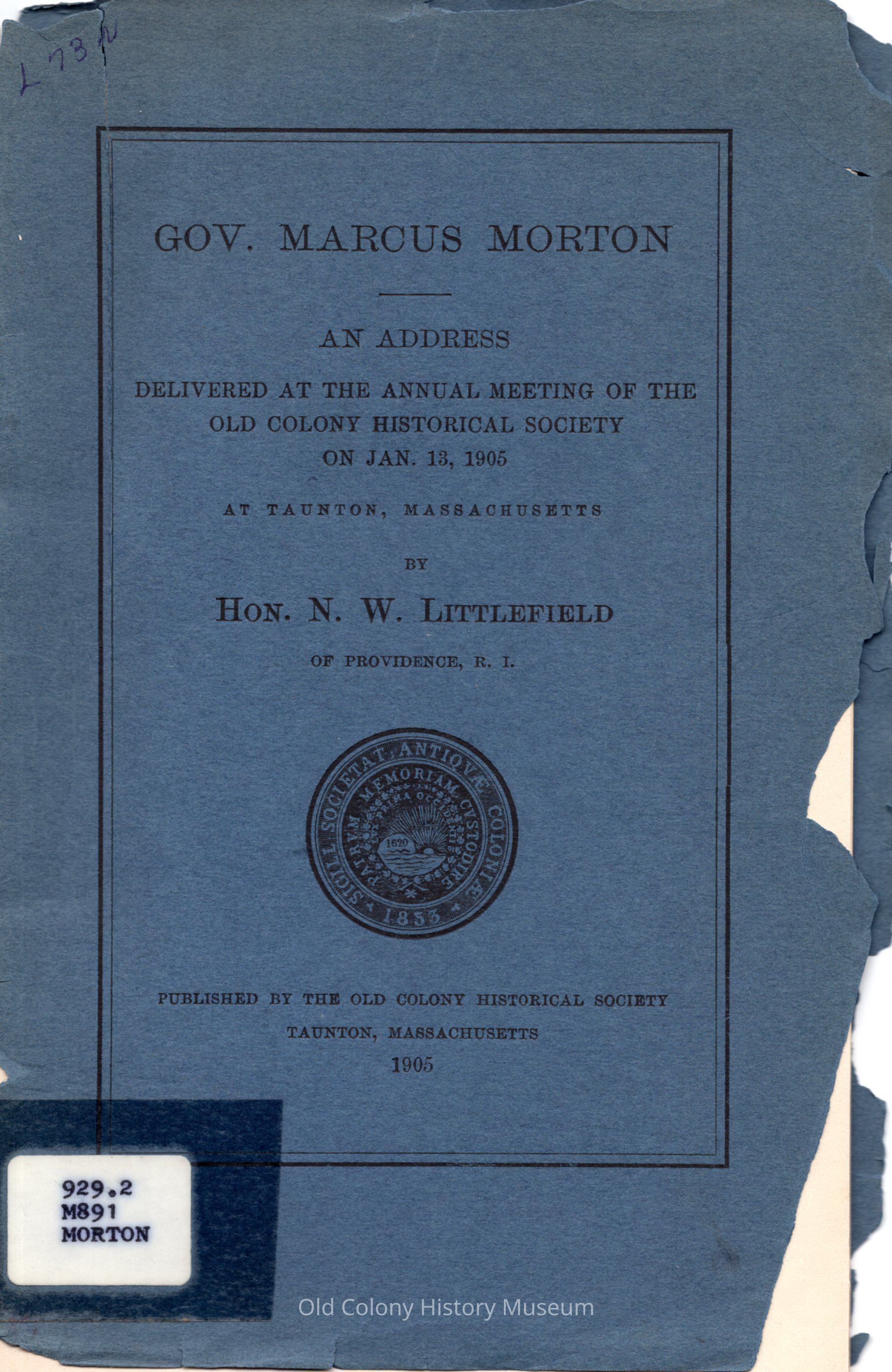 Gov. Marcus Morton: An Address Delivered at the Annual Meeting of the Old Colony Historical Soc. On Jan. 13, 1905Entry/Object ID