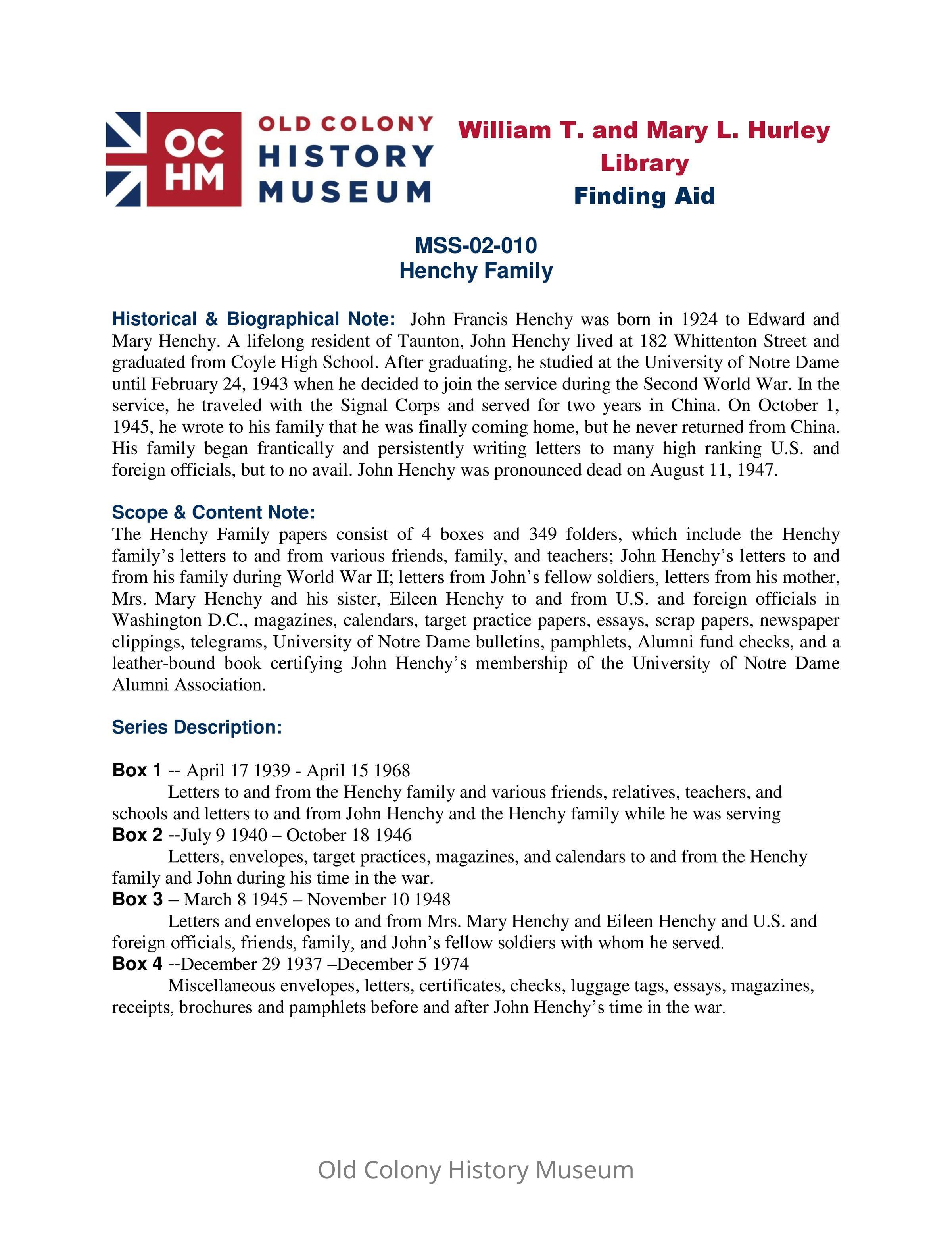 John Francis Henchy was born in 1924 to Edward and Mary Henchy. A lifelong resident of Taunton, John Henchy lived at 182 Whittenton Street and graduated from Coyle High School. After graduating, he studied at the University of Notre Dame until February 24, 1943 when he decided to join the service during the Second World War. In the service, he traveled with the Signal Corps and served for two years in China. On October 1, 1945, he wrote to his family that he was finally coming home, but he never returned from China. His family began frantically and persistently writing letters to many high ranking U.S. and foreign officials, but to no avail. John Henchy was pronounced dead on August 11, 1947.Archive Details