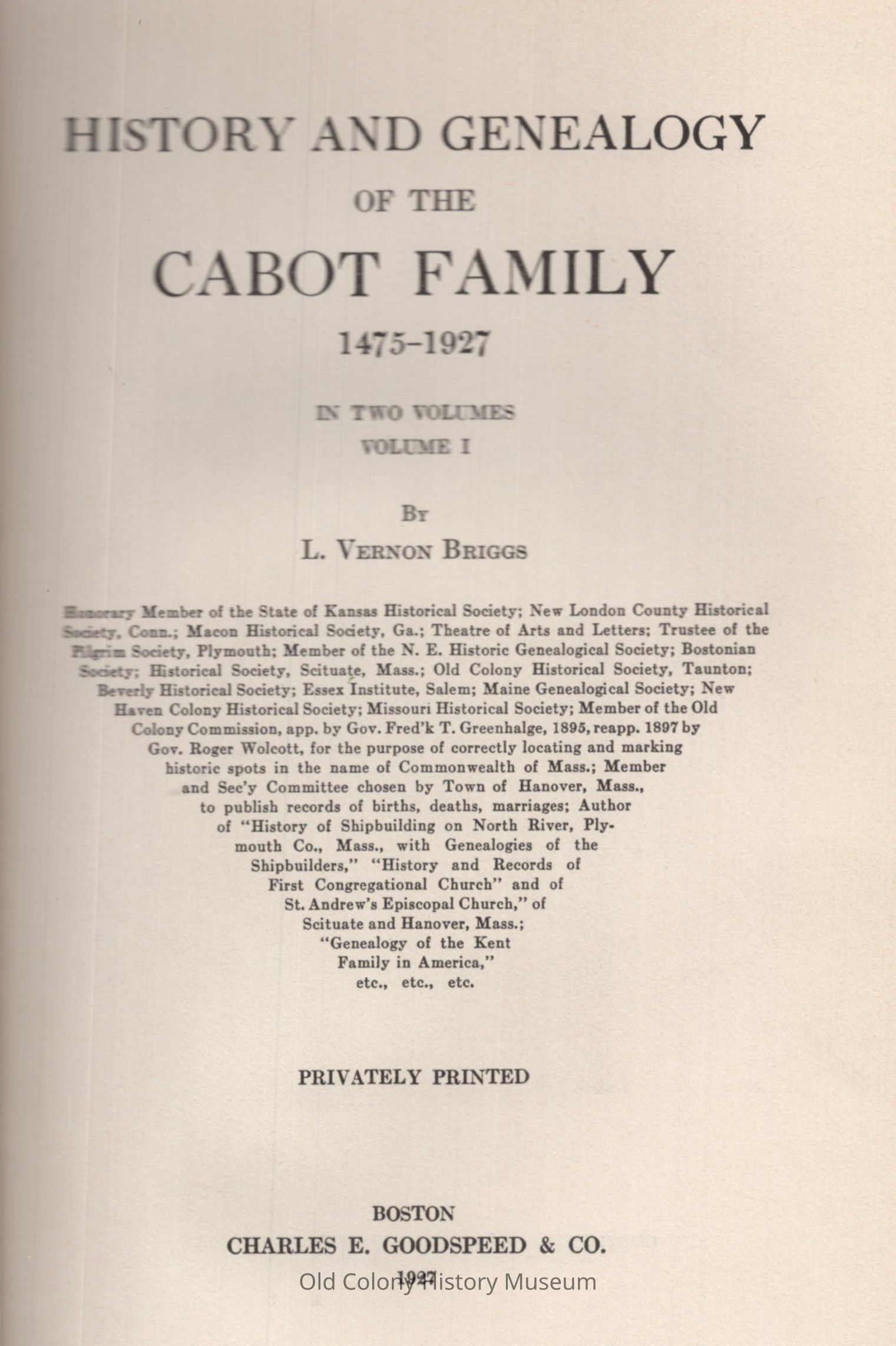 History and Genealogy of the Cabot Family, 1475-1927Entry/Object ID