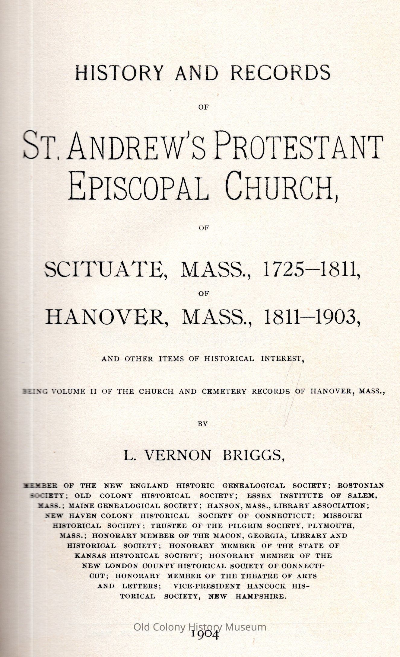 History and Records of St. Andrew's Protestant Episcopal Church of Scituate, Mass., 1725-1811, of Hanover, Mass., 1811-1903, and Other Items of Historical InterestEntry/Object ID