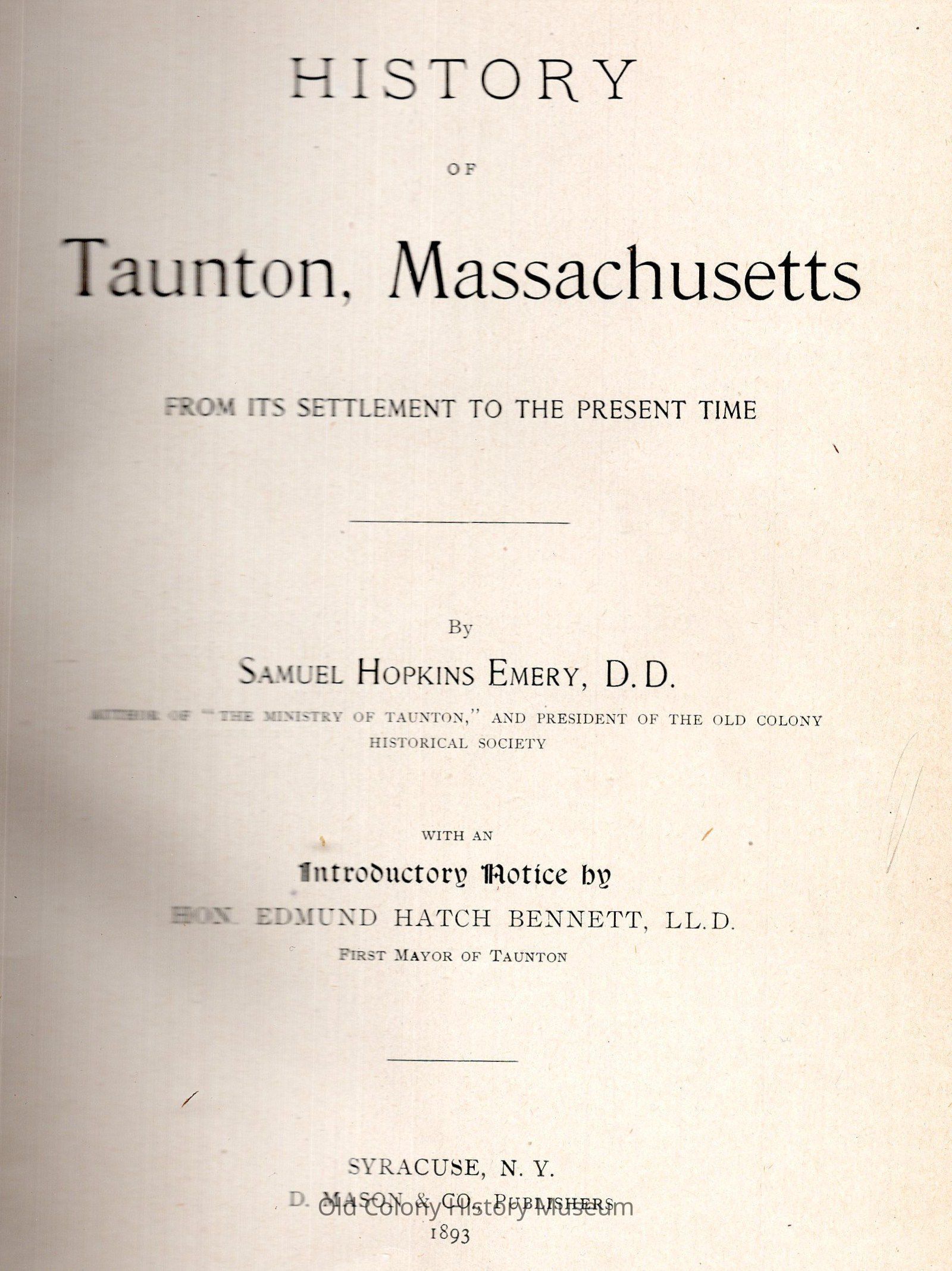 With an introductory notice by Hon. Edmund Hatch Bennett � Supplement to the History of Taunton, Massachusetts. By Samuel Hopkins Emery. Syracuse, N.Y., D. Mason & co., 1894. with his History of Taunton, Massachusetts. Syracuse, N.Y. 1893.