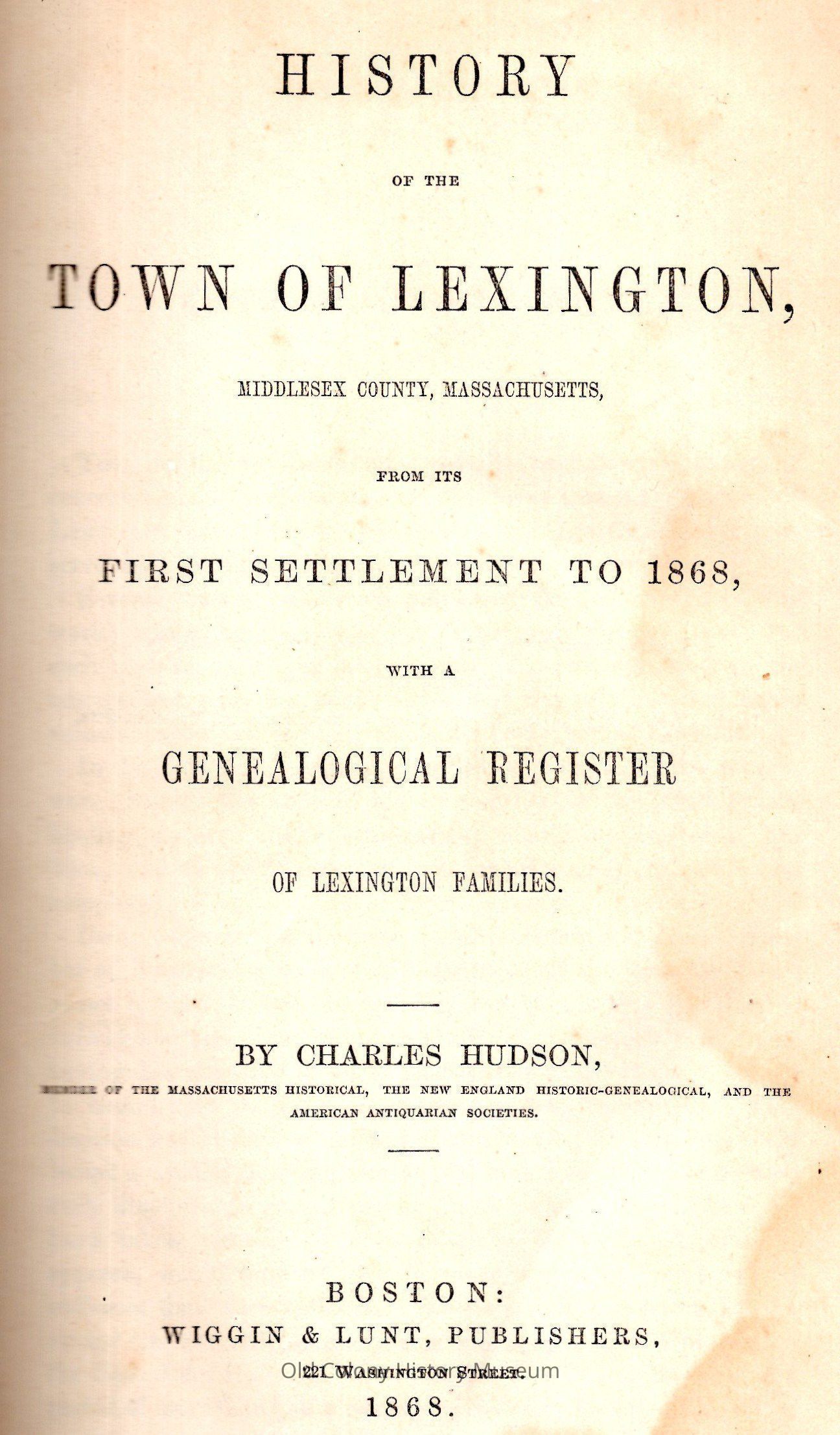 History of the Town of Lexington, Middlesex County, Massachusetts, from its first settlement to 1868, with a genealogical register of Lexington families.Entry/Object ID
