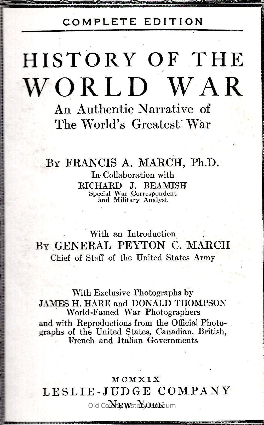 History of the World War: An Authentic Narrative of the World's Greatest War, by Francis A March in Collaboration with Richard J. Beamish With an intro. By Peyton C. March, with Exclusive Photos. By James H. Hare and Donald Thompson and with reproductions from the official photos. of the United States, Canadian, British, French and Italian GovernmentsEntry/Object ID