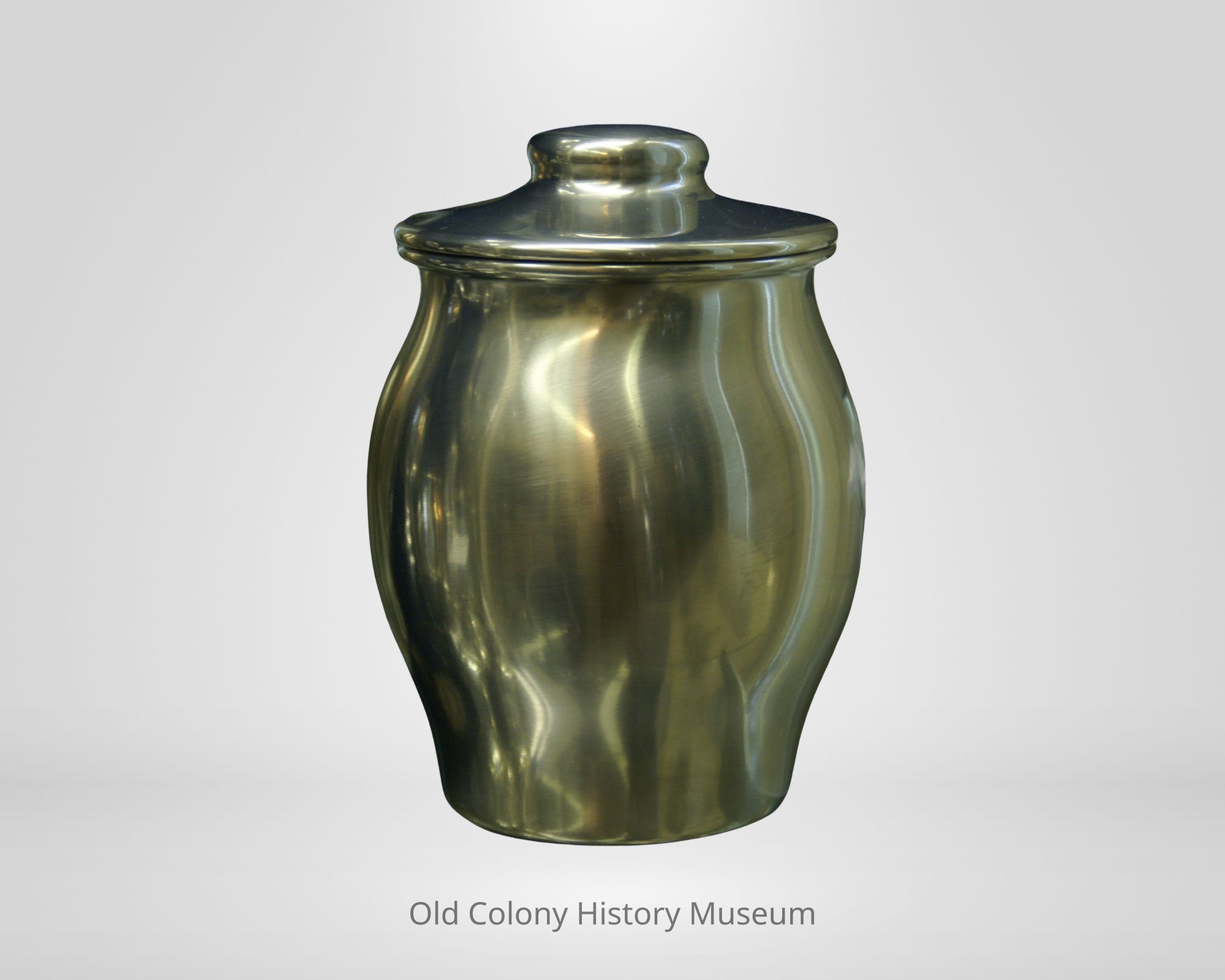 Pewter tobacco jar with a hurricane shape and separate lid with round pull.