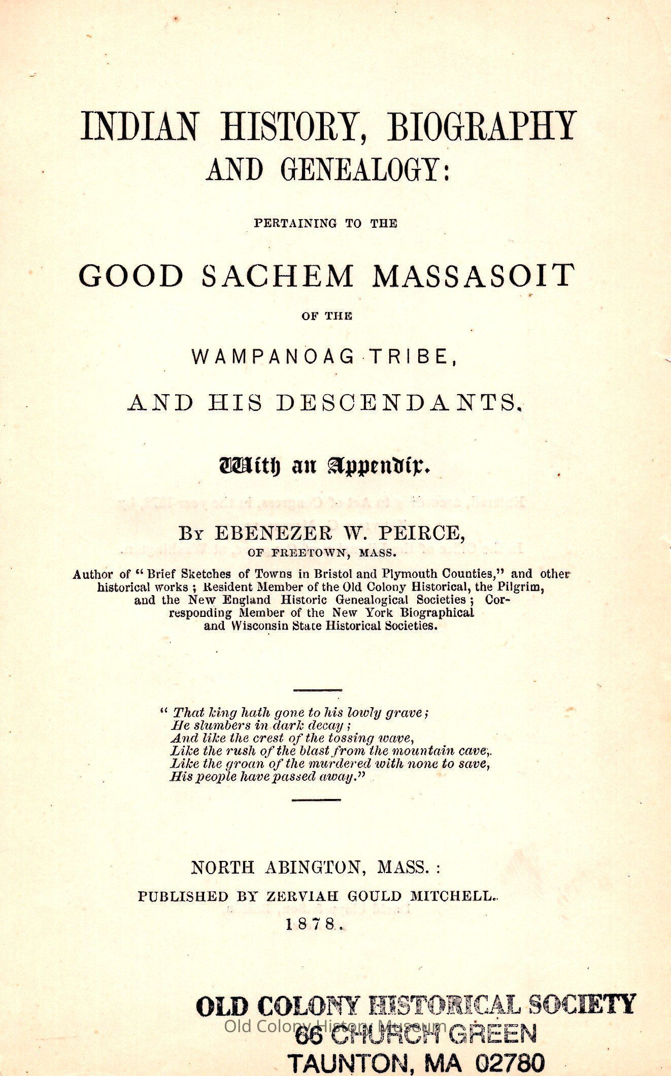 Indian history, biography, and genealogy; Pertaining to the good sachem Massasoit of the Wampanoag tribe, and his descendants.Entry/Object ID