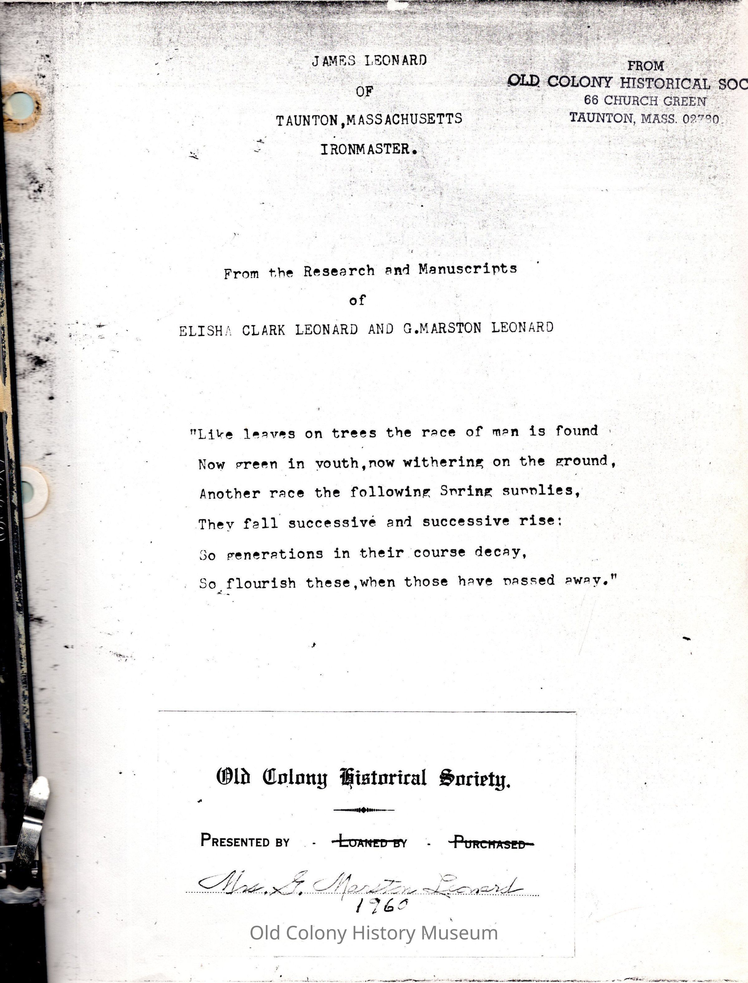James Leonard of Taunton, Massachusetts Ironmaster. From the Research and Manuscripts of Elisha Clark Leonard and G. Marston LeonardEntry/Object ID