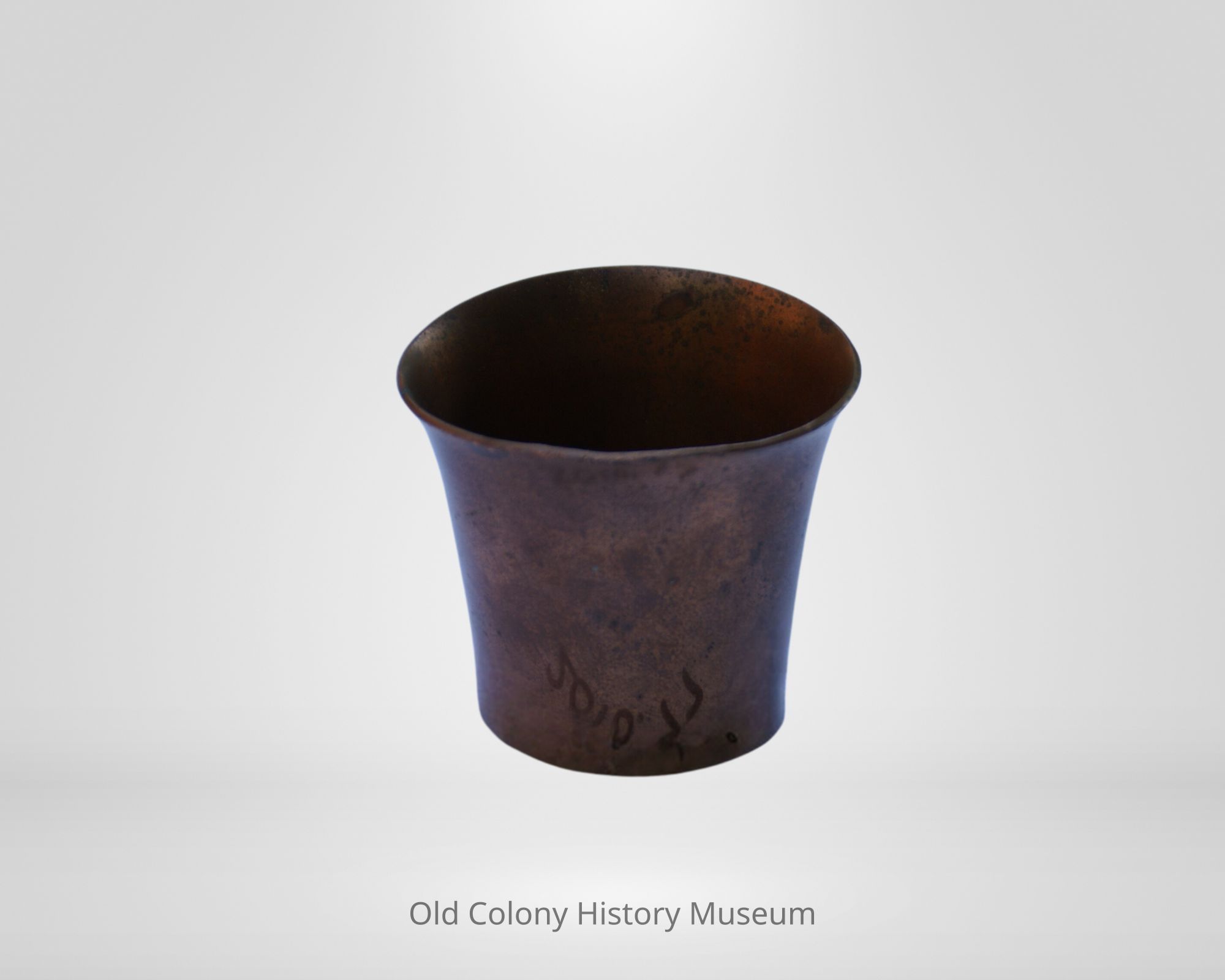Possibly a jigger. Flat bottom. Sides taper towards bottom. Upper edge slightly outturned. Slightly ovoid shape towards top.