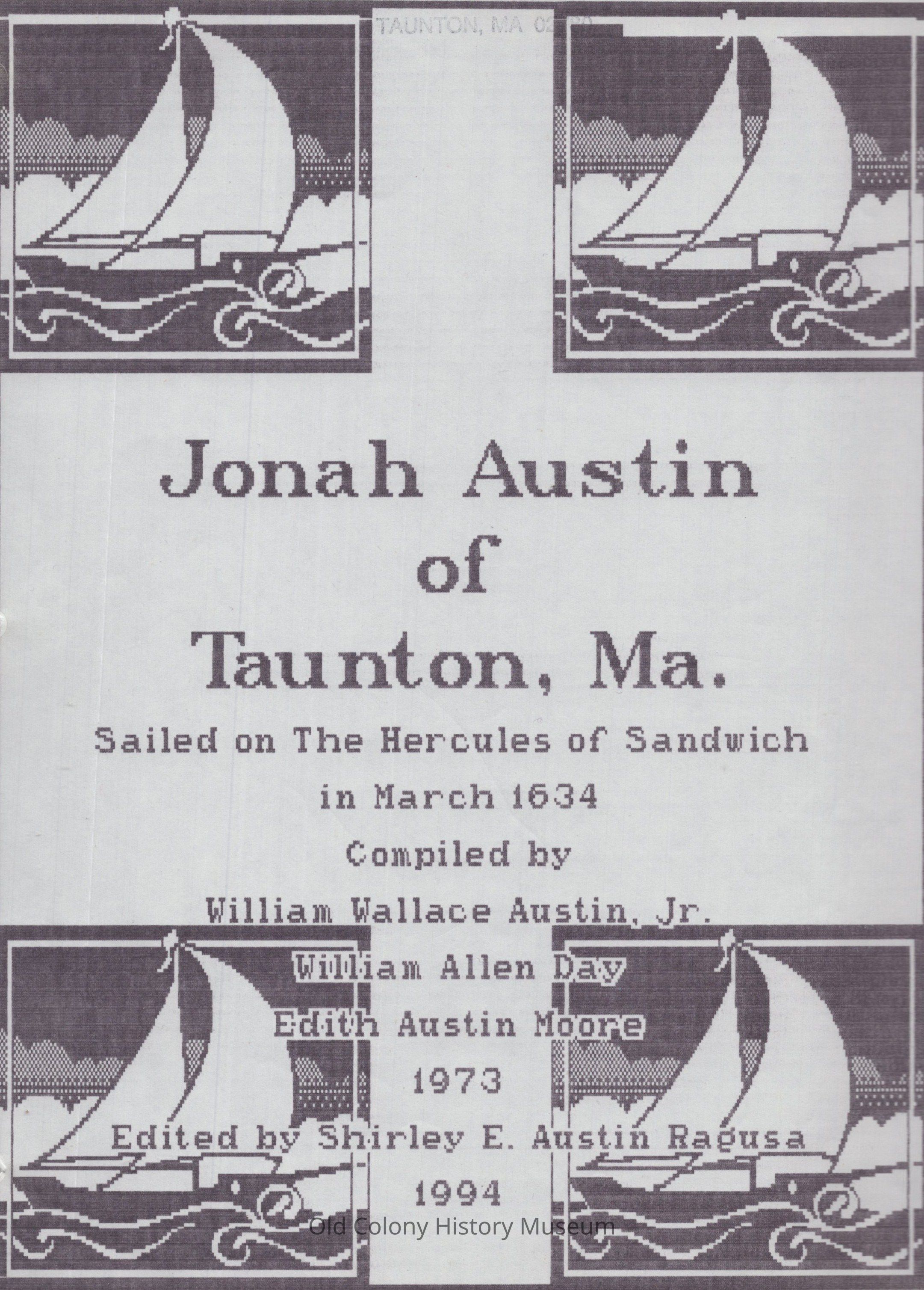 Jonah Austin of Taunton, MA, Sailed on the Hercules of Sandwich in March 1634; compiled by William Wallace Austin, Jr., William Allen Day, Edith Austin Moore (1974), edited by Shirley E. Austin Ragusa (1994).Entry/Object ID