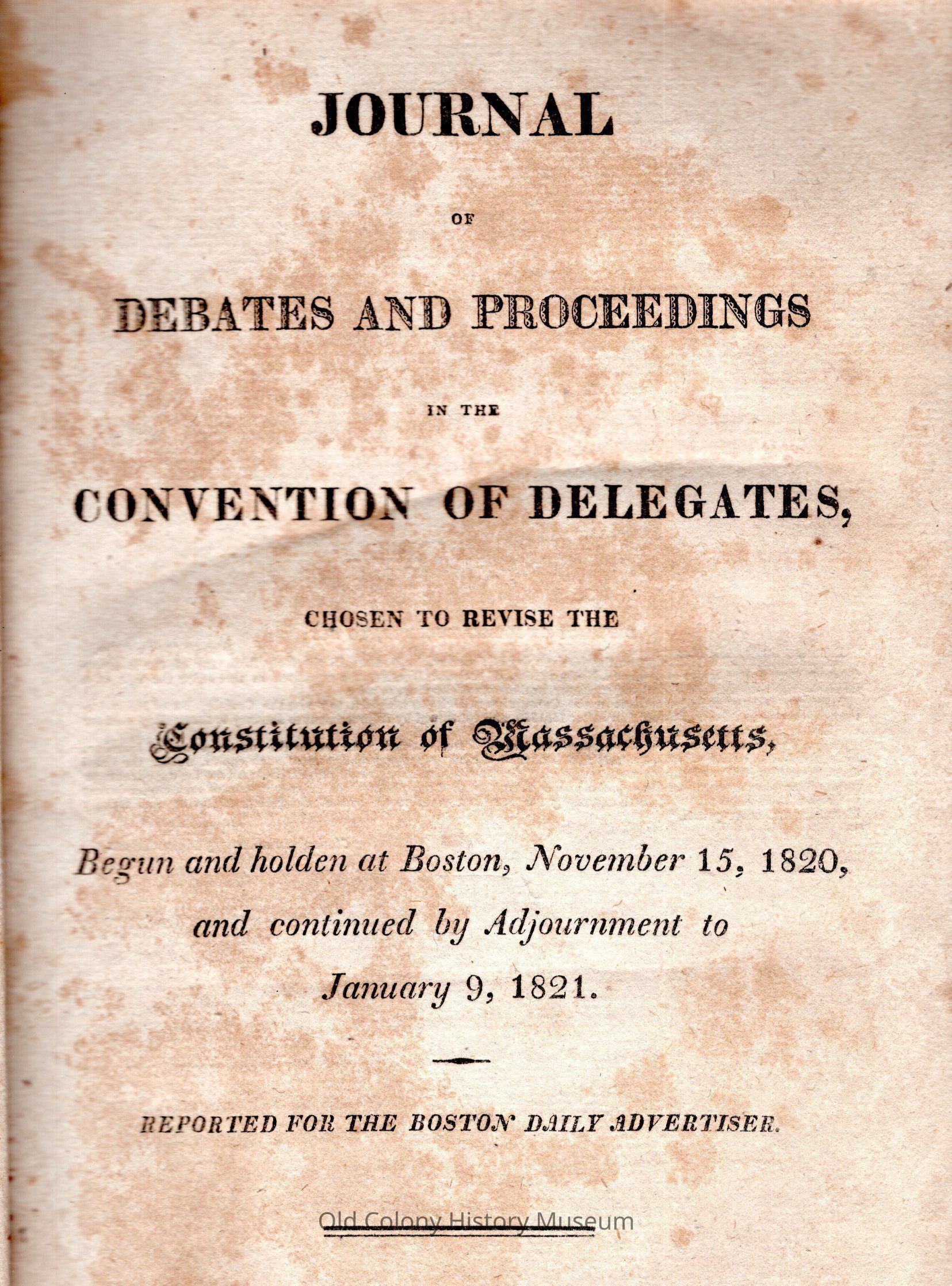 Journal of Debates and Proceedings in the Convention of delegates chosen to revise the constitution of Massachusetts; begun and holden at Boston, November 15, 1820, and continued by adjournment to January 9, 1821Entry/Object ID