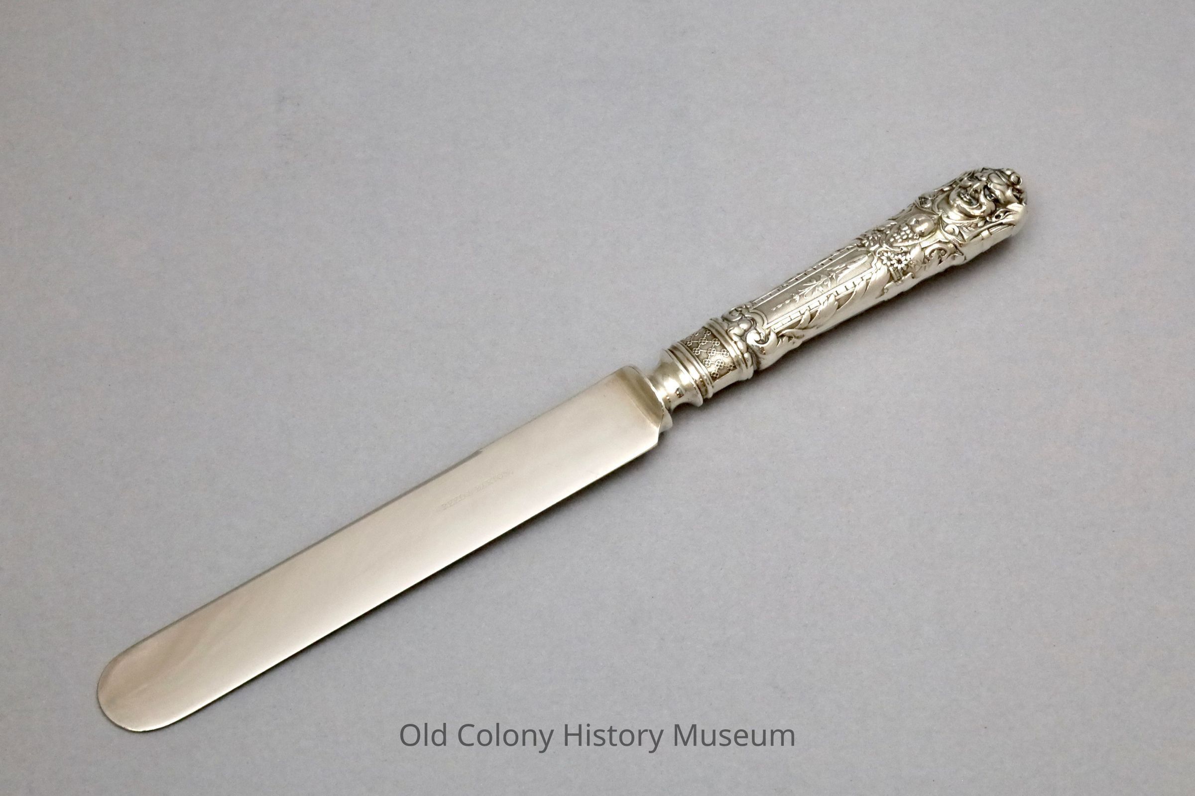 11 Reed & Barton silver plated dinner knives in "renaissance" pattern with floral sprays and acanthus and a gargoyle on either side. A rectangular machine stitched muslin storage bag with eighteen compartments and a fold over flap.Lexicon