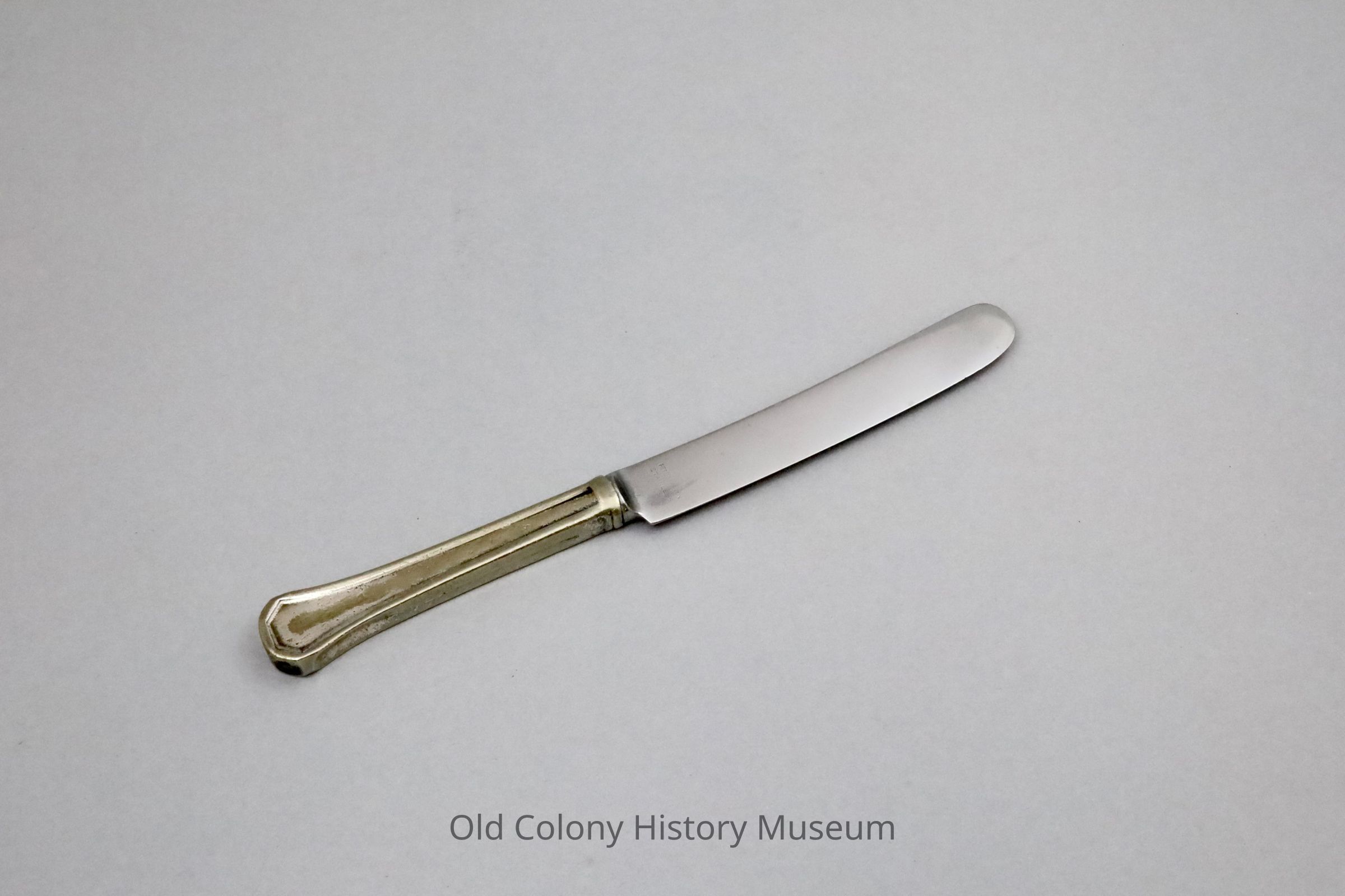 Reed& Barton silver plated knife, Transfer Restaurant. Stainless steel blade. "Transfer" stamped under handle. See 2001.53 and L1972.55c for similar pattern.