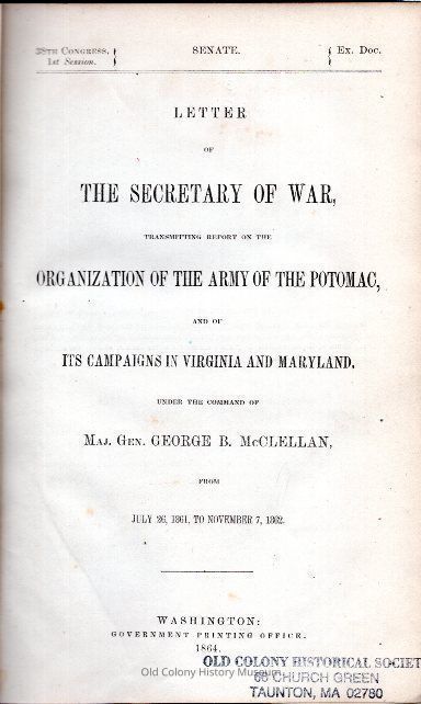 Letter of the Secretary of War, transmitting report on the organization of the Army of the Potomac, and of its campaigns in Virginia and Maryland, under the command of Maj. Gen. George B. McCellan, from July 6, 1861, to November 7, 1862.Entry/Object ID