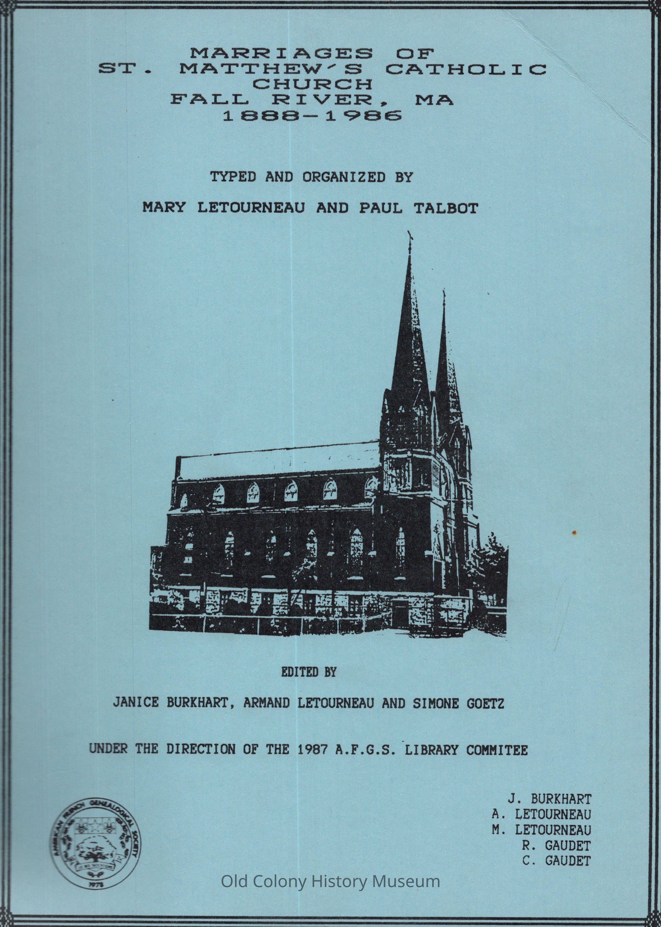 1. St. Matthew's Catholic Church (Fall River, Mass.). 2. Church records and registers--Massachusetts--Fall River. 3. Marriages--Massachusetts--Fall River (Town). 4. Fall River (Mass:Town)--Genealogy.Book Details