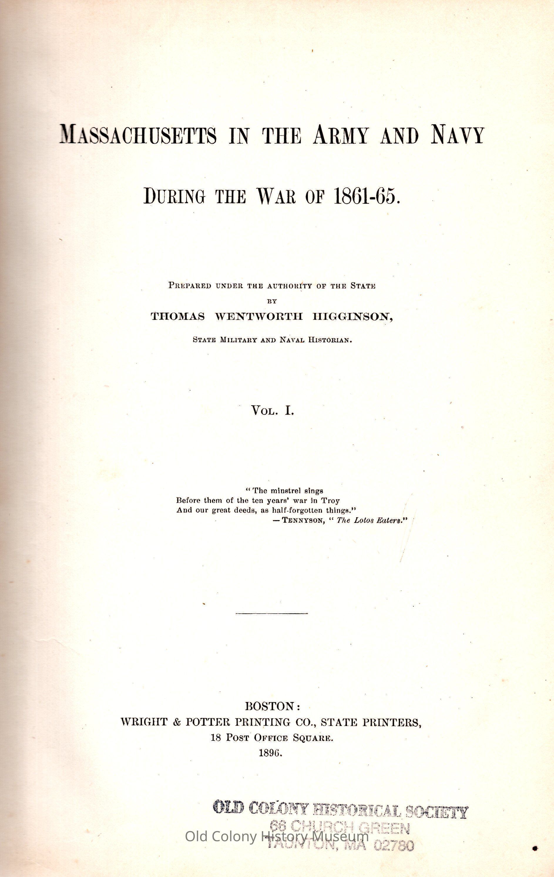 Vol. 1, 1896. "List and records of Massachusetts naval officers," by Capt. C. W. Wilson: v.2, p. 1-165. "Massachusetts women in the Civil War." by Mary A. Livermore: V.2, p. 586-603. "List of authorities" : v., p. 571-572. "List of books relating to Massachusetts history during the Civil War": v. 2, p. 604-608. "Bibliographical index to periodical literature bearing on Massachusetts services during the Civil War," by Mrs. F. W. Jacques: V. 2, p. 609-733.