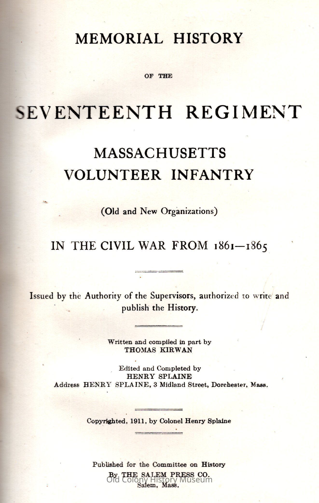 Memorial history of the Seventeenth regiment, Massachusetts volunteer infantry (old and new organizations) in the civil war from 1861-1865, issued by the authority of the supervisors, authorized to write and publish the historyEntry/Object ID