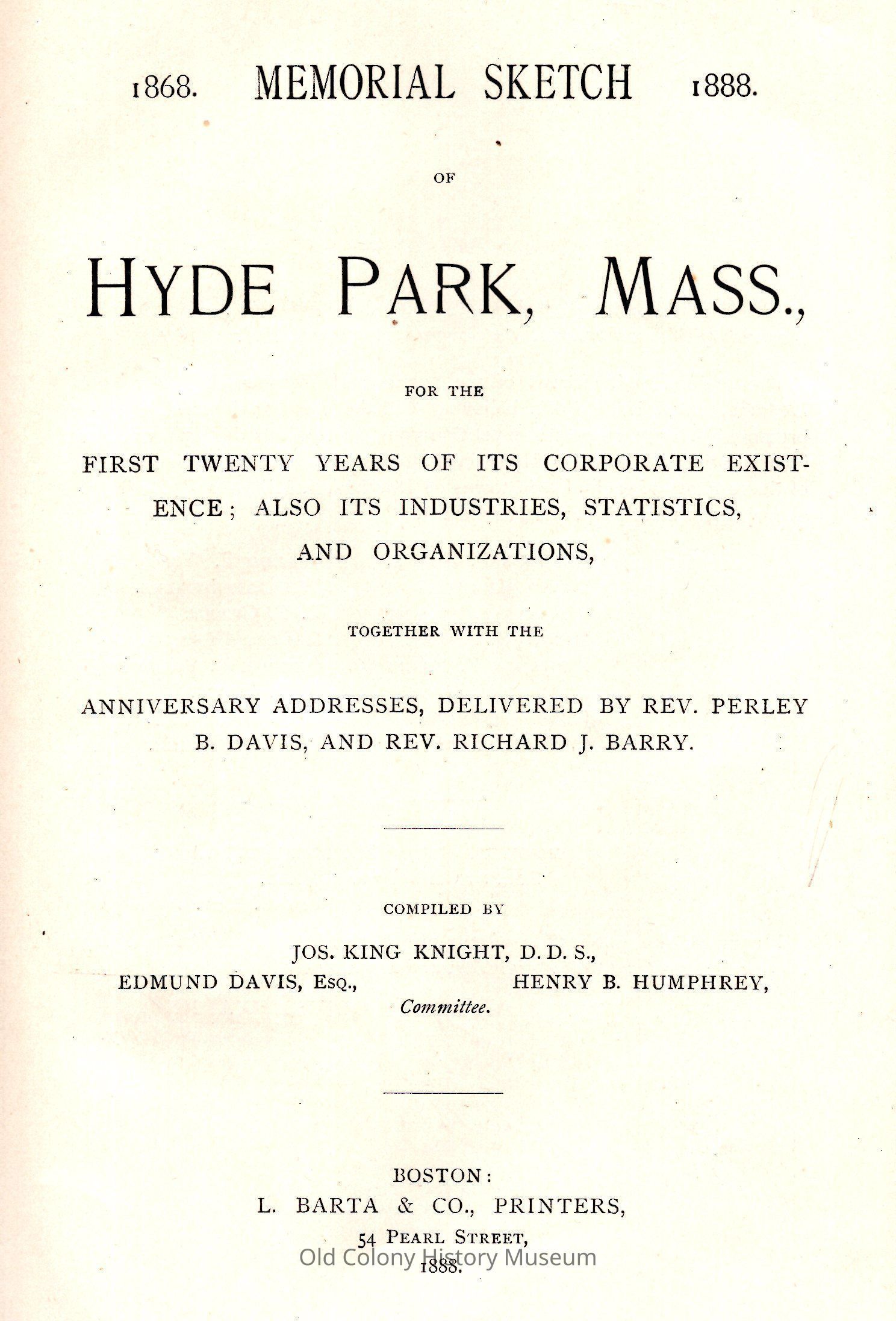 Memorial Sketch of Hyde Park, Mass., for the first twenty years of its corporate existence [1868-1888]; also its industries, statistics, and organizations, together with the anniversary addresses, delivered by Rev. Perley B. Davis, and Rev. Richard J. Barry.Entry/Object ID