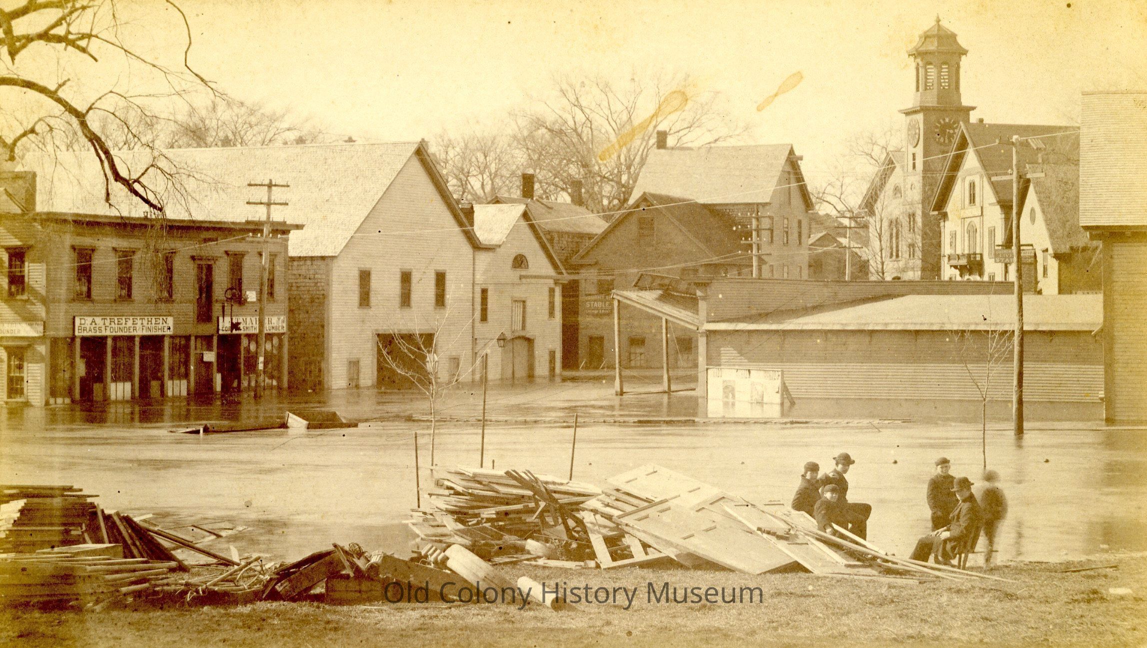 "Cohannet St. during the flood-showing Winslow Church & Music Hall in the distance. Church...Crocker building in the foreground. Sunday Feb. 14 1886."Lexicon