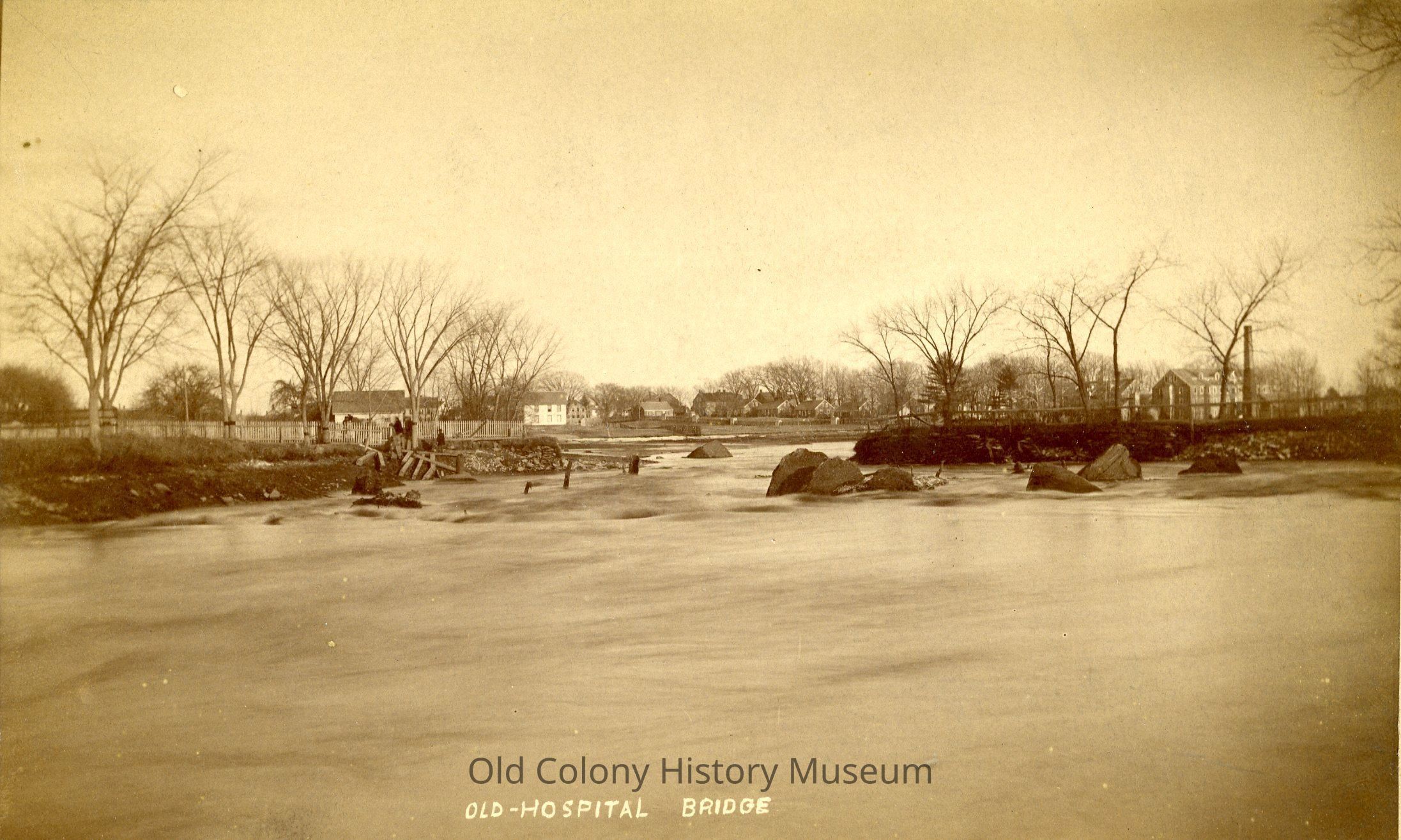 "Before the flood of Feb. 1886, Danforth Street crossed Mill River where people are standing. The new bridge was built about 500 ft. north of the old one. Picture taken in spring of 1886."Lexicon